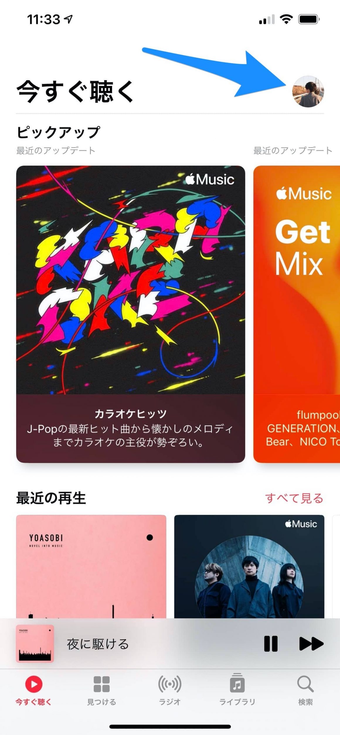 ミュージックアプリに戻り、「今すぐ聴く」の右上に表示されているアイコンをタップします。(画像を設定していない場合はシルエットが表示されています)