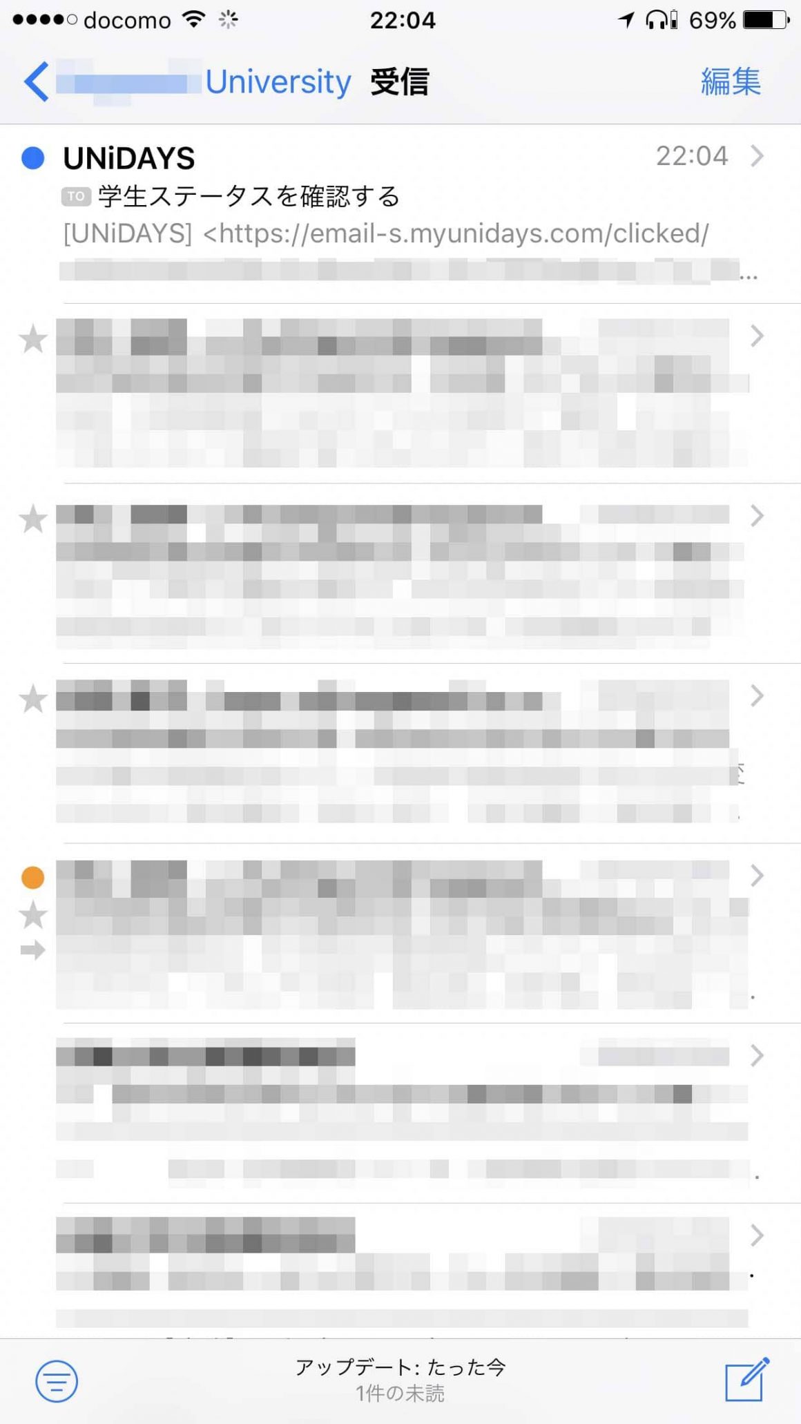 メールアプリに移動し、大学メールのアカウントに届いたUNiDAYSのメールを開きます。なお、Webメールなどを利用している人は、そちらから開きましょう。