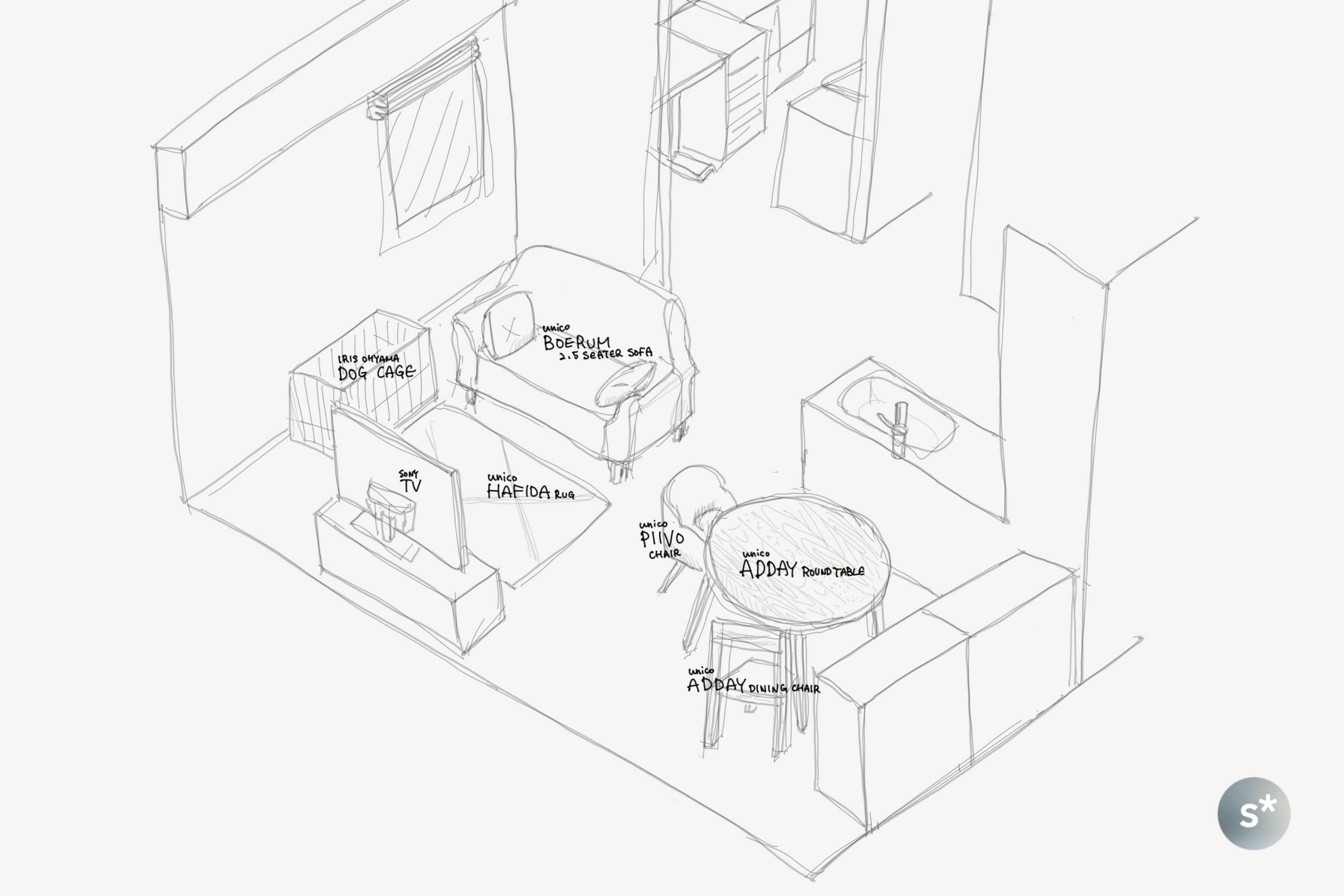 結局、うちのリビングダイニングはこんな配置になりました。ラフなスケッチで恐れ入りますが。