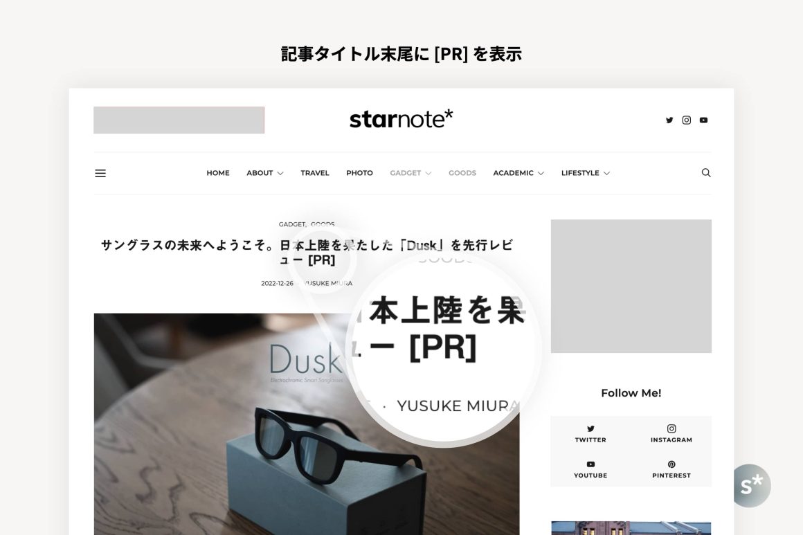 記事タイトルの末尾に [PR] を表示し、読者に対して広告記事であることを明示します。これにより、当ブログ内の記事一覧画面だけでなくSNSなどでシェアされた際にも広告記事であることが一目で分かるため、リンクを開くかどうか判断するための情報を提供します。