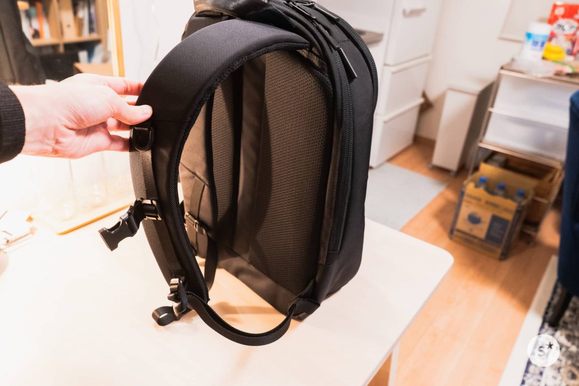 そして、背面はメッシュ素材です。夏場でも蒸れずに持ち運べていいですね。また、バンドも広くて圧力を分散してくれるし、必要に応じて左右のバンド間隔を固定できて、上半身全体に加重が分散されます。