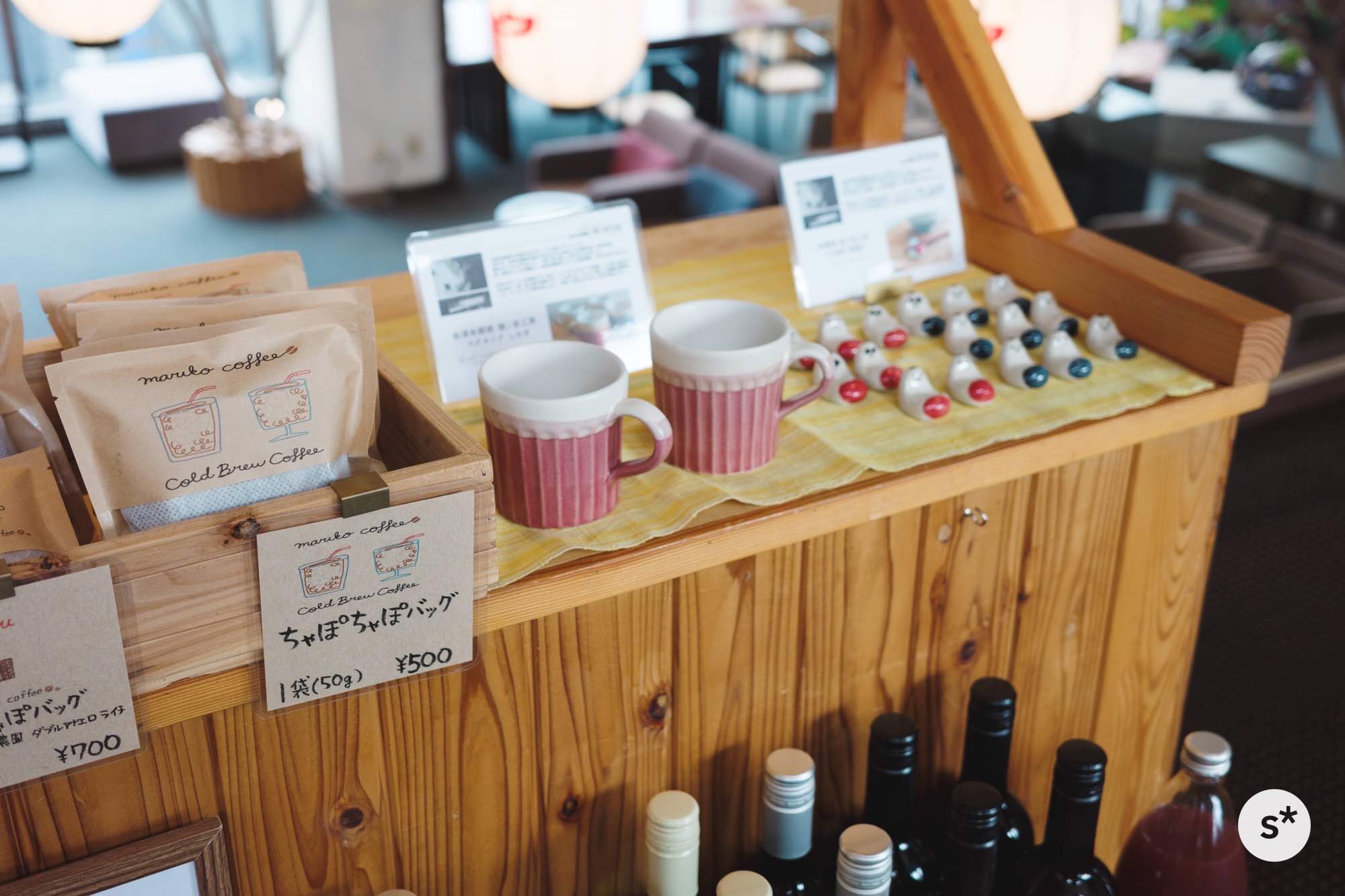 宿泊していた「星野リゾート 磐梯山温泉ホテル」では、毎朝7:30〜9:30に「会津の朝市」と銘打って、野菜や果物、お漬物、地酒など、その日のおすすめの会津の食材が並びます。また、それと一緒に食材を作っているお店のグッズも並ぶのです。