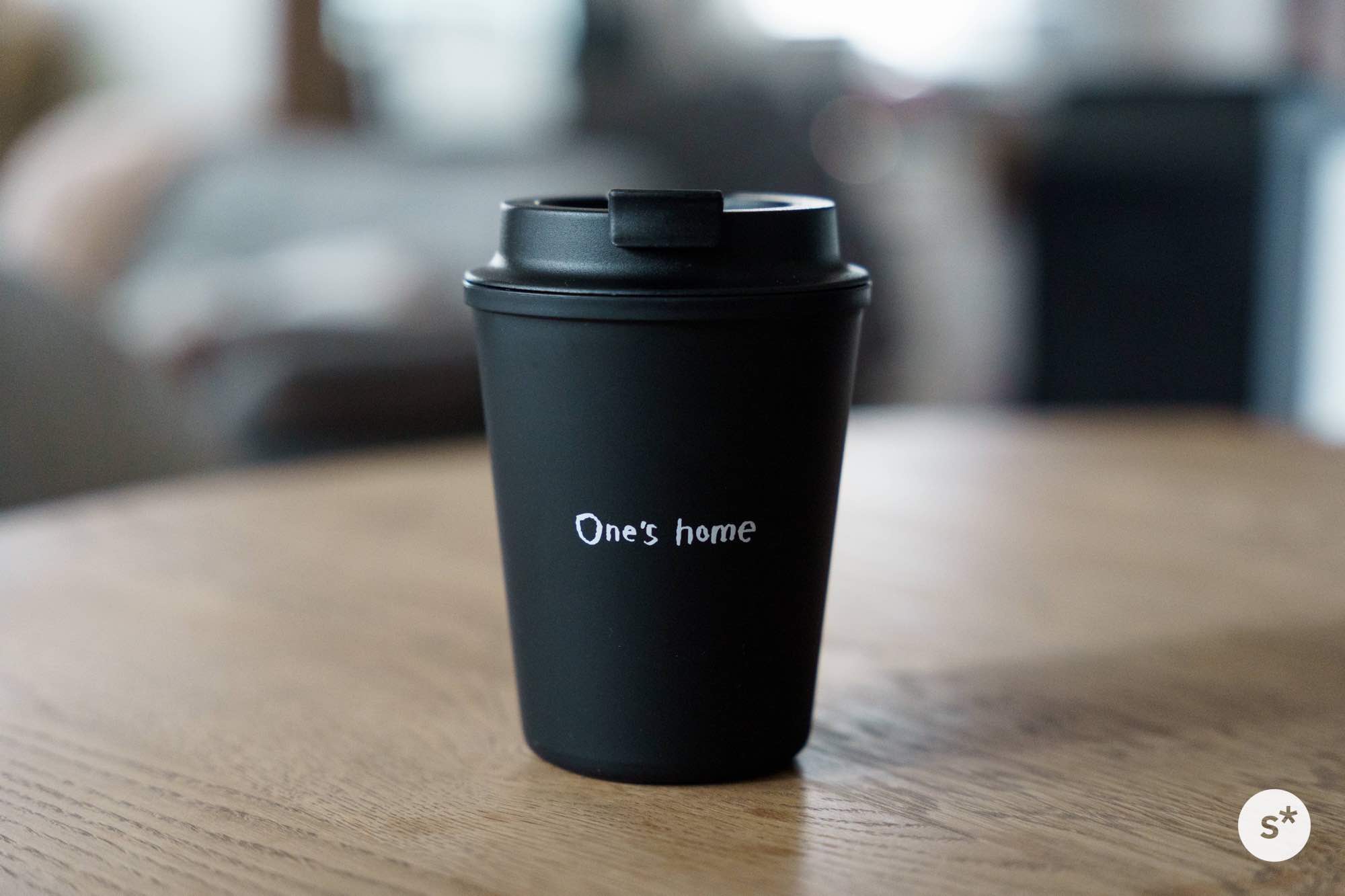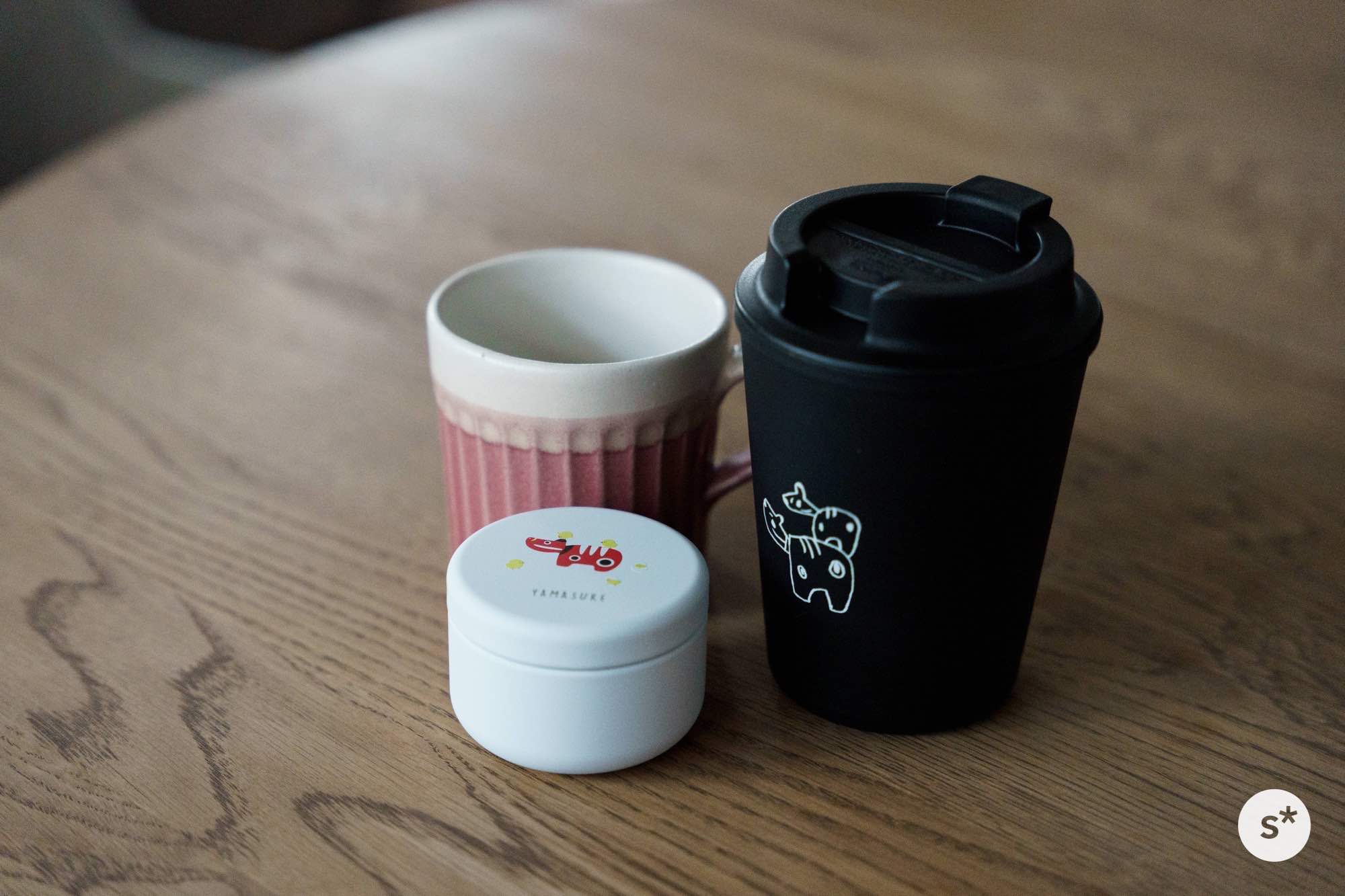 最後が僕のやつ、赤べこの柄が入ったタンブラーです。One’s homeというカフェのオリジナル商品のようで、RIVERSのウォールマグ スリークに赤べこの絵がプリントされています。