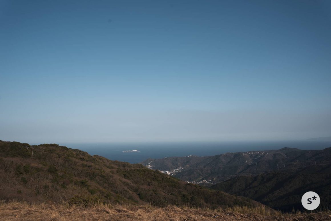 道中には、車を止めて景色を眺められる場所がたくさんあります。こちらは「多賀」。山の麓は熱海、海に浮かんでいる島は初島です。