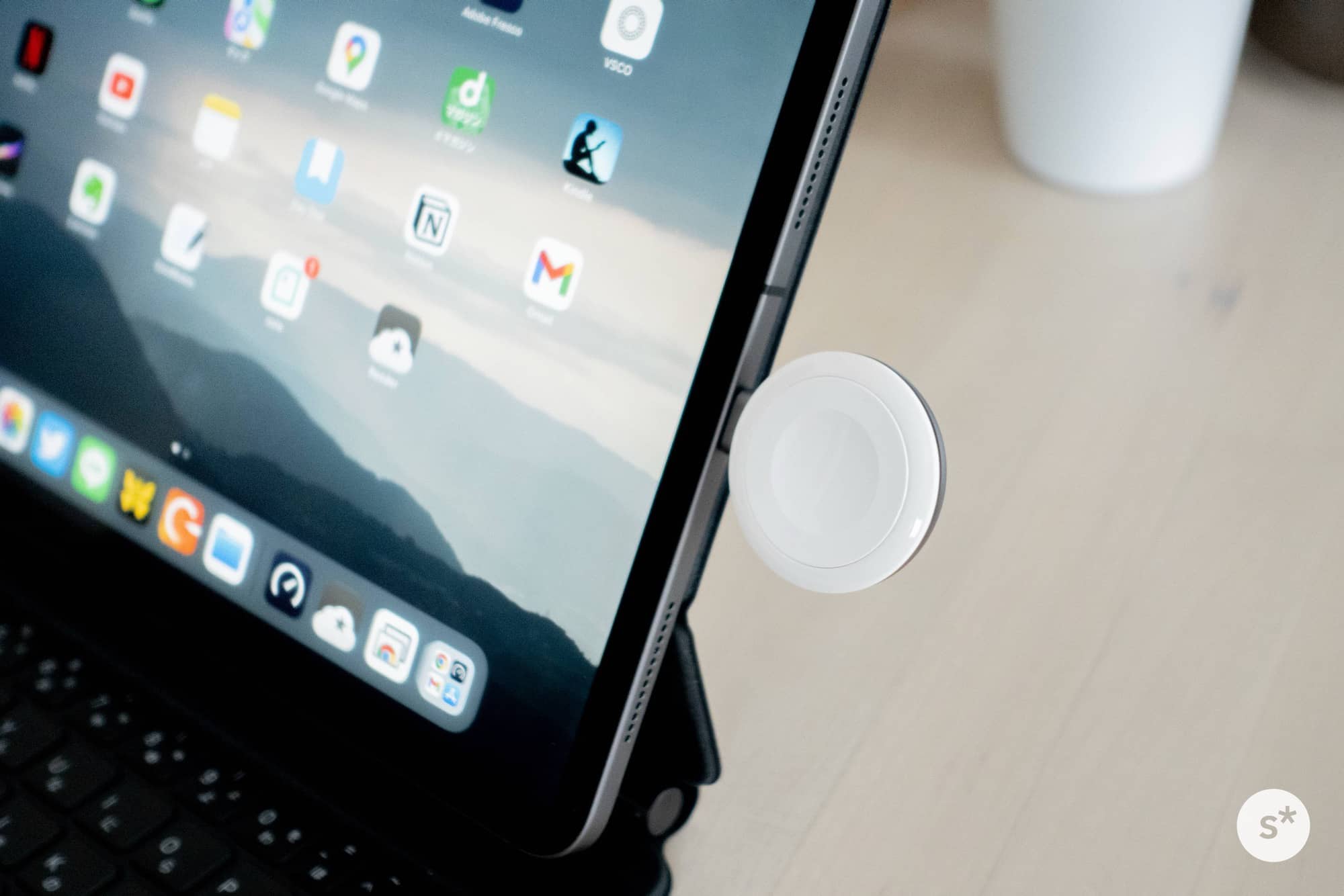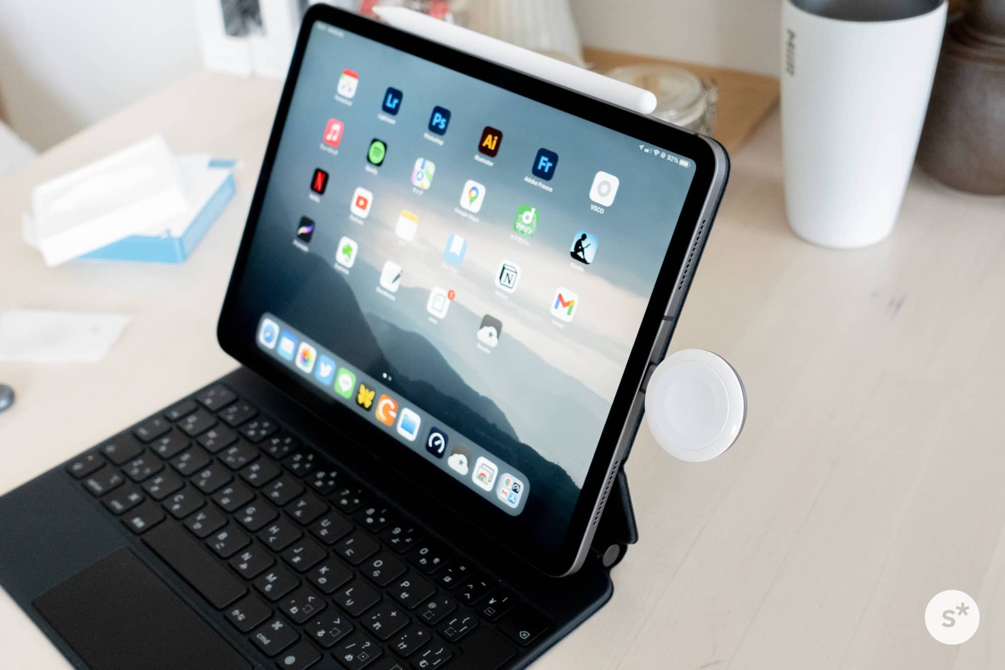 もちろん、USB-CポートであればiPadやMacからも充電することができます。iPad Proに取り付けるとこんな感じです。