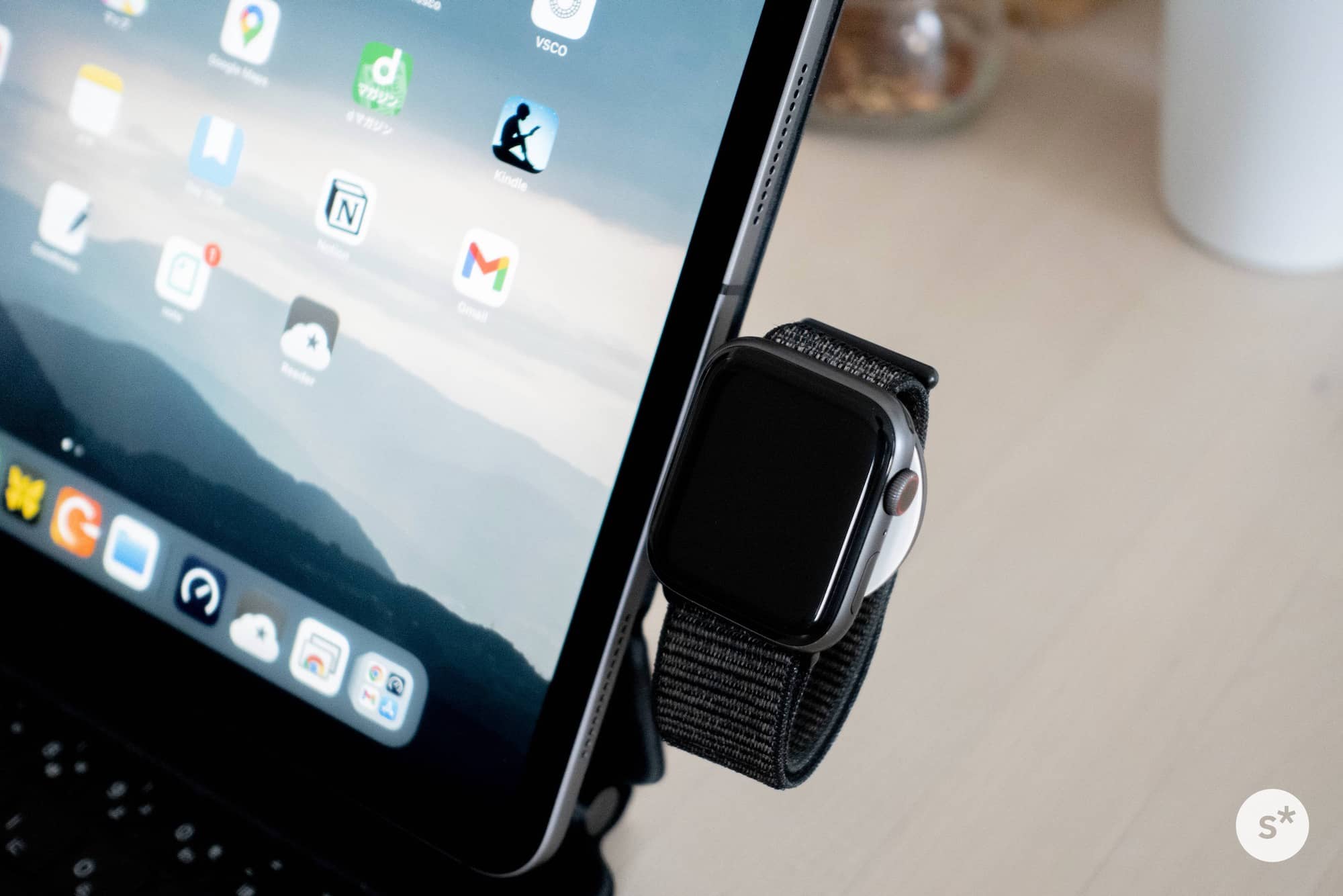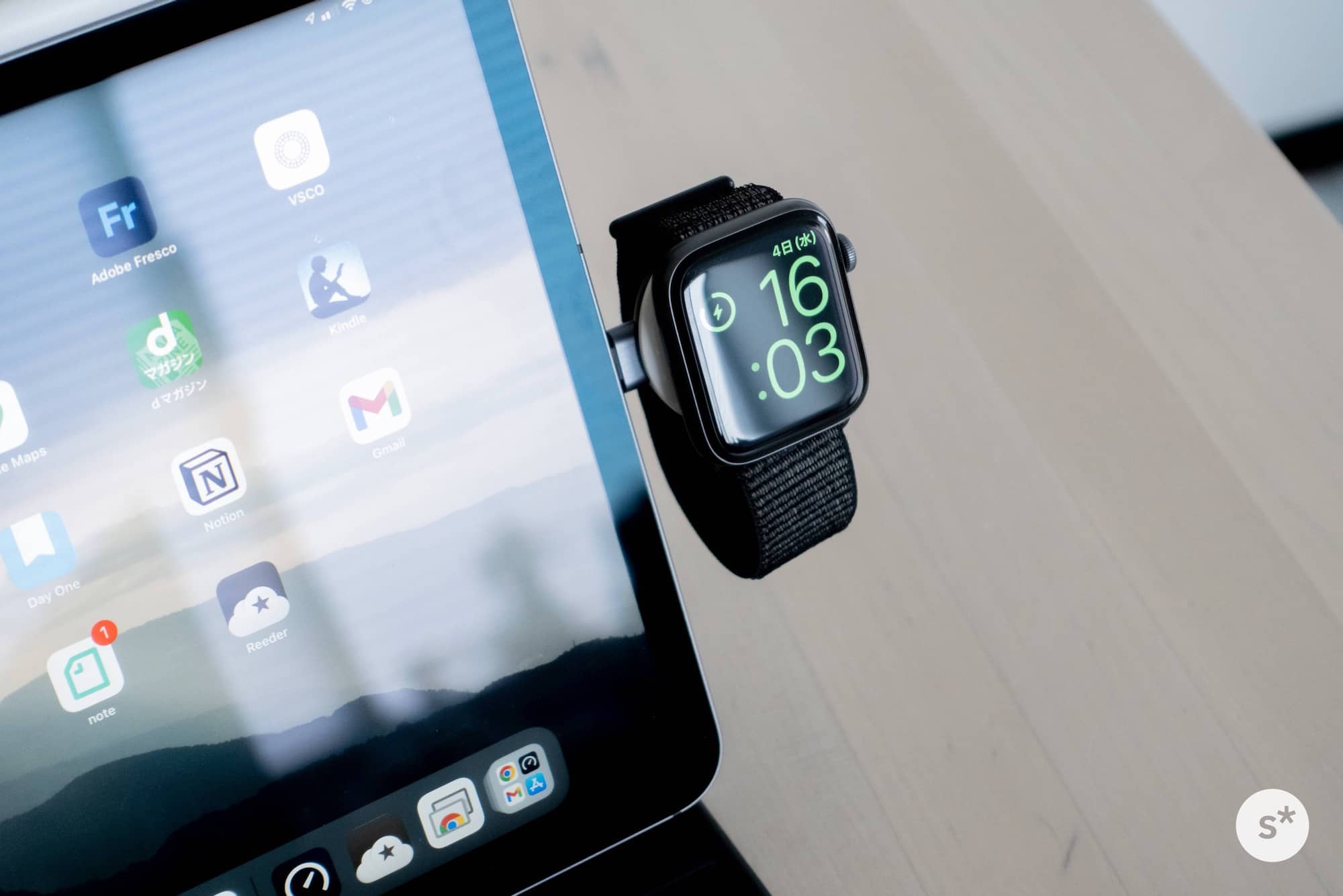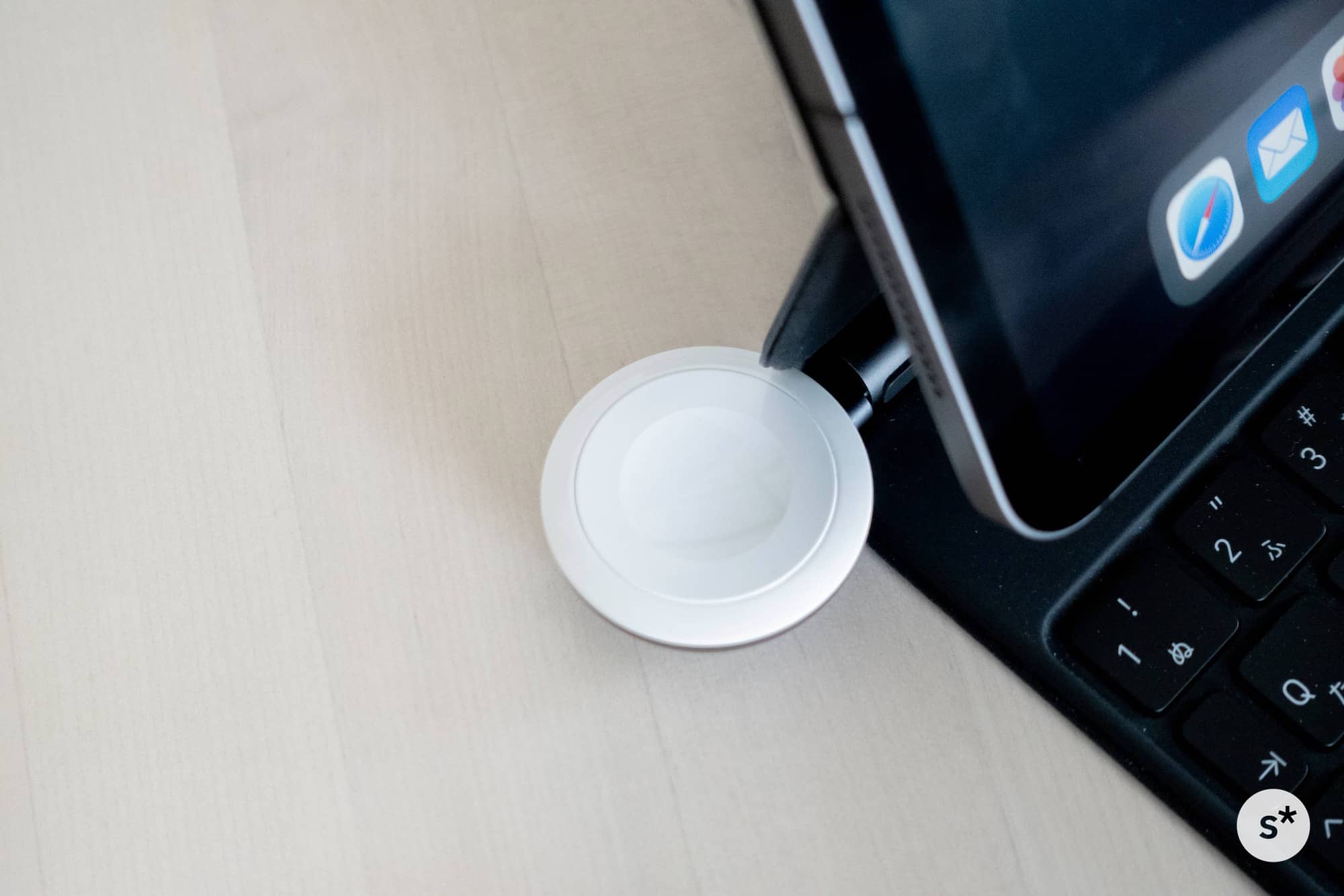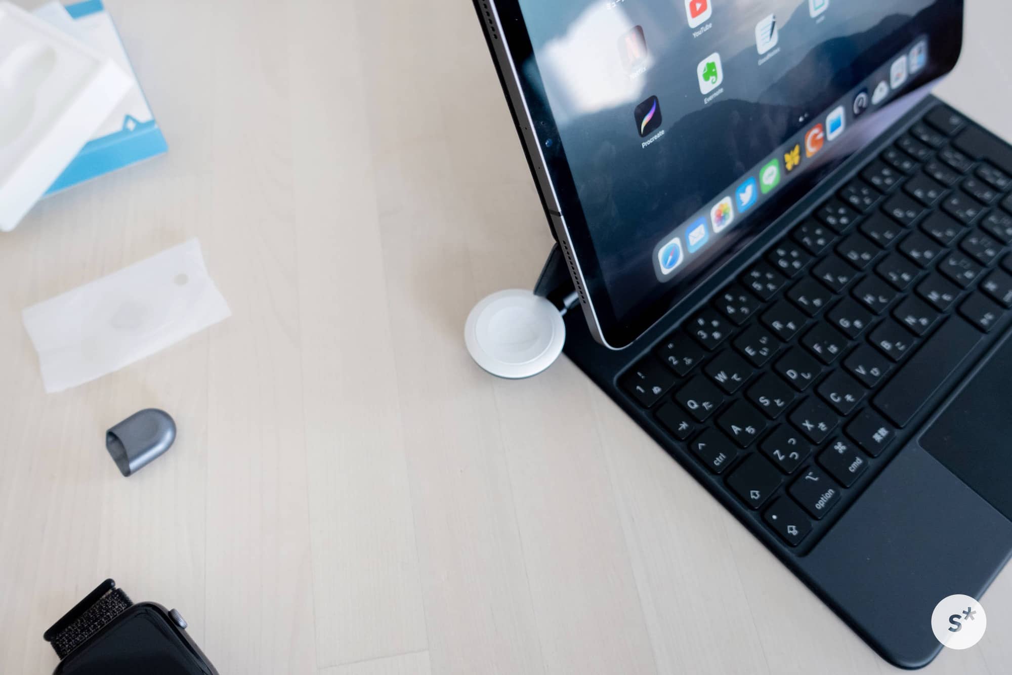 ちなみに、iPad用Magic Keyboardに搭載されているUSB-Cポートに接続してみましたが、こちらも干渉してうまく充電できませんでした。接続自体はできますが、Apple Watchがうまく乗りません。