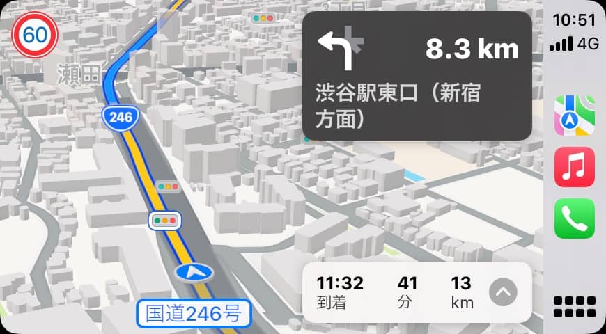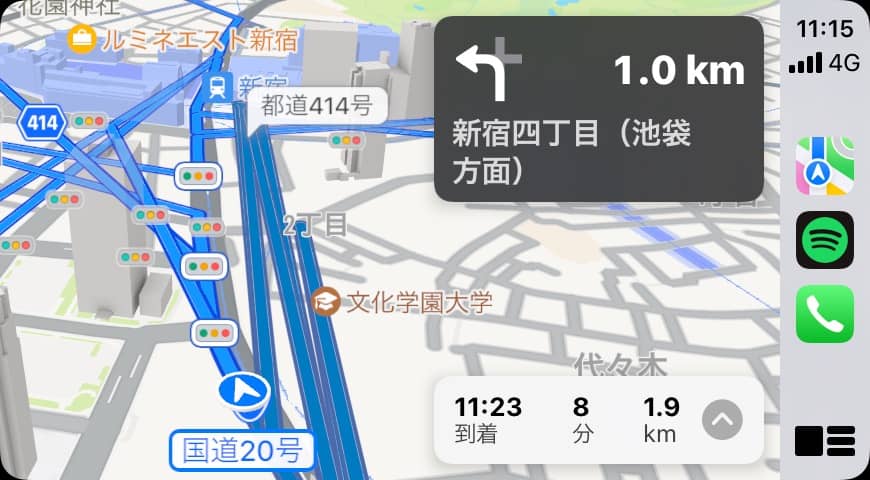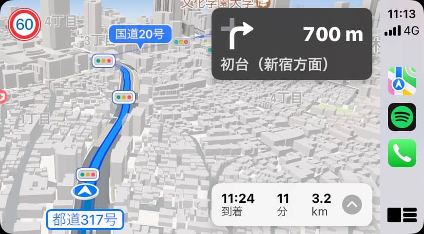 ちなみに、下のスクリーンショットが以前の3D表示です。運転中に一目で直感的に状況把握できるのはiOS 15の方だと感じます。