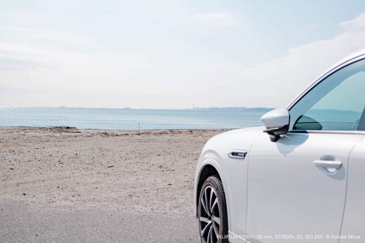 ここは砂浜まで車で入ることができる(砂浜の中が一部舗装されて駐車場になっている)ので、海岸で車の写真を撮るのには最高の場所です。冬だから人も少ないし、他の車から離れて適当に止めました。駐車場を探さないといけない都心とは大違いだ。