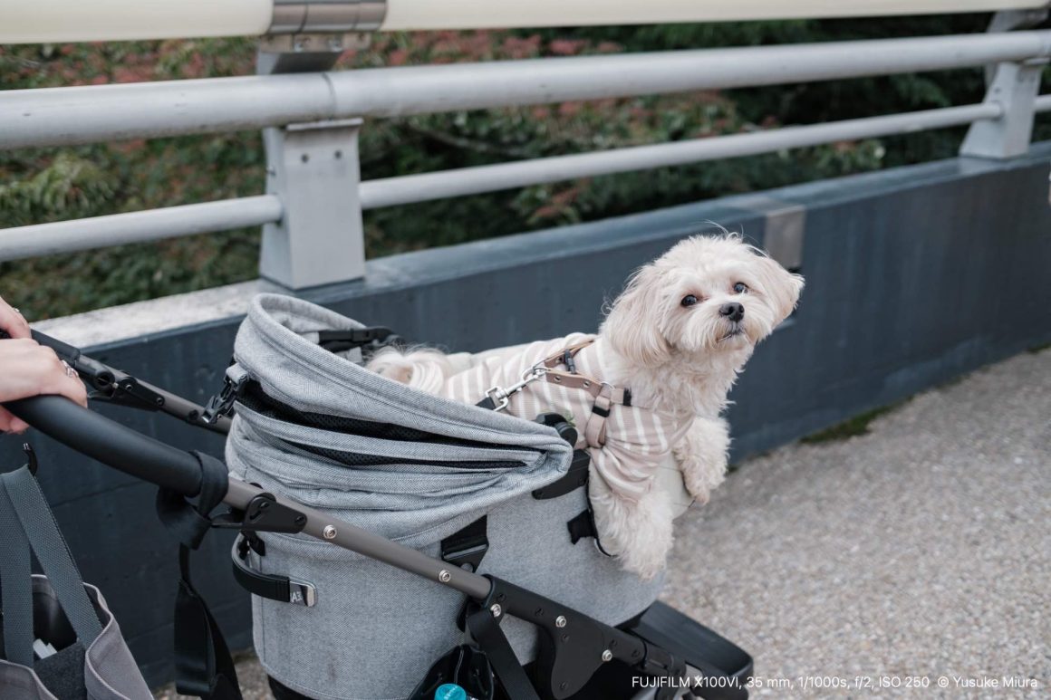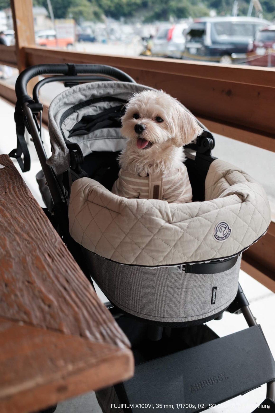 僕がリードを引いて歩かせたのですが、人が多いところが嫌なのか、視点が高いカートの方が楽しいのか、早く乗せろ乗せろと言ってくる始末。もう少し歩こうよと無理矢理引いて、ひとしきり歩いたところで、カートに戻ってもらいます。