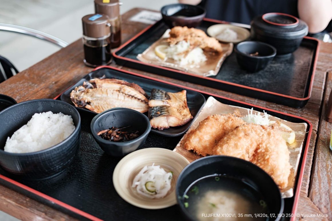 注文は、いつもの「アジフライ定食」。そして、干物の盛り合わせを2人でシェアします。注文して10分ほどで到着しました。ソースをかけて早速頬張ります。