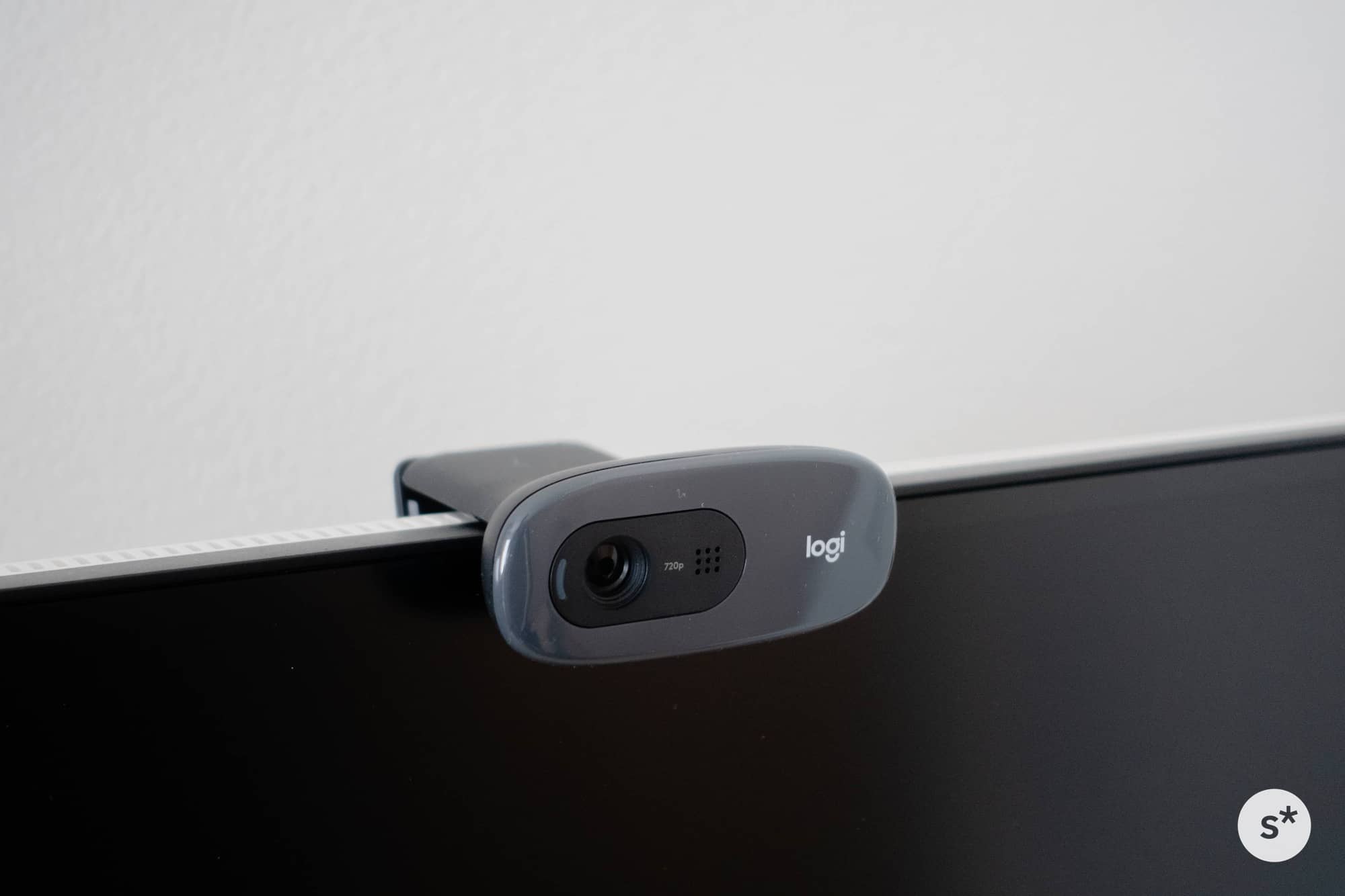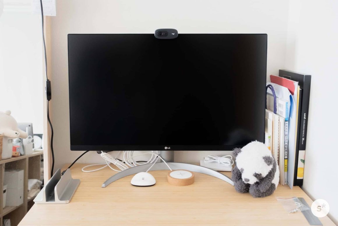 ディスプレイの上部にはWeb会議用のカメラも設置しました。画質は求めていないので、とりあえずLogicoolの安いモデルを購入。