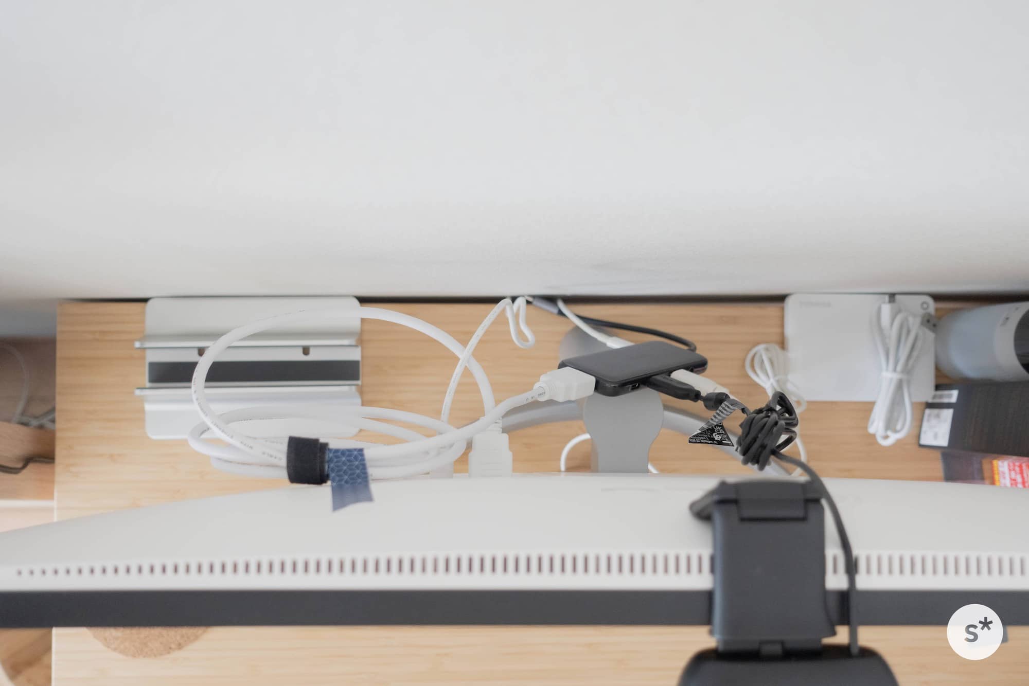 ディスプレイの下にはQi対応のワイヤレス充電器を設置。メカメカしいデザインの充電器が多い中、このIKEAの充電器はインテリアに馴染む優しいデザインで気に入っています。この充電器もUSB-Cハブに接続しています。