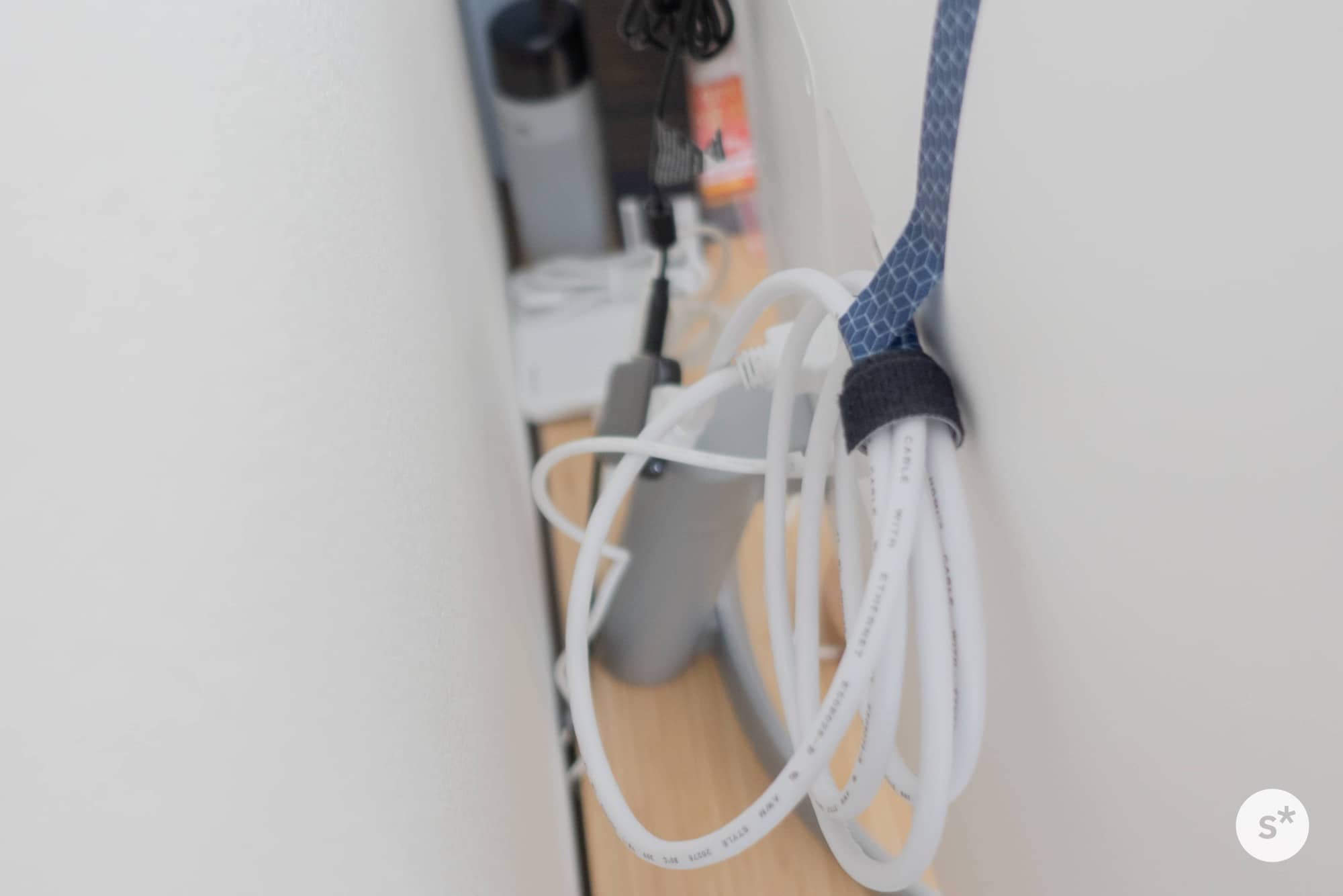 MacBook Airはスタンドに立ててディスプレイの裏側に設置。持ち出すことは少ないと思われるので、MacBook Airへのアクセシビリティよりも机上を広く使えることを優先しました。