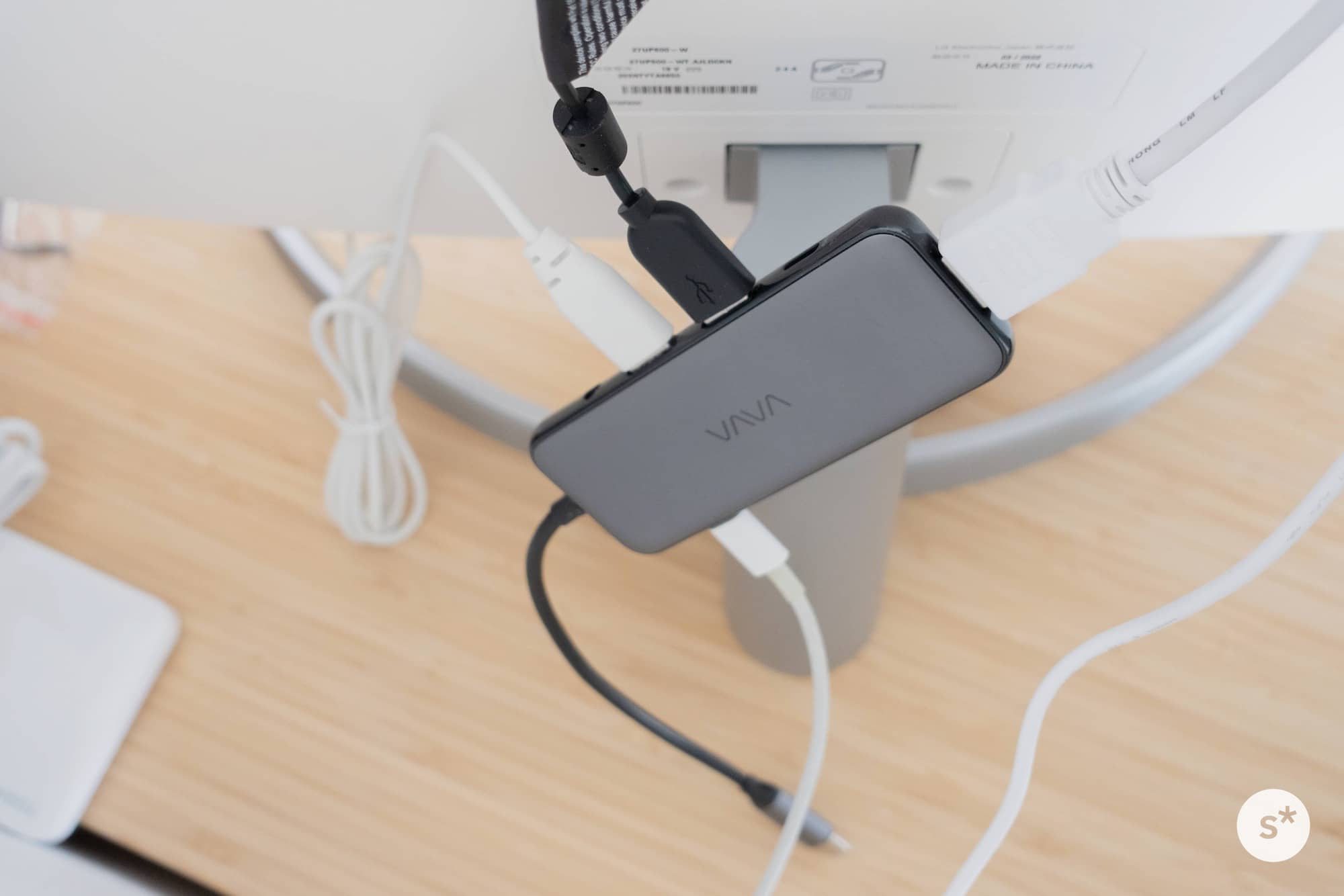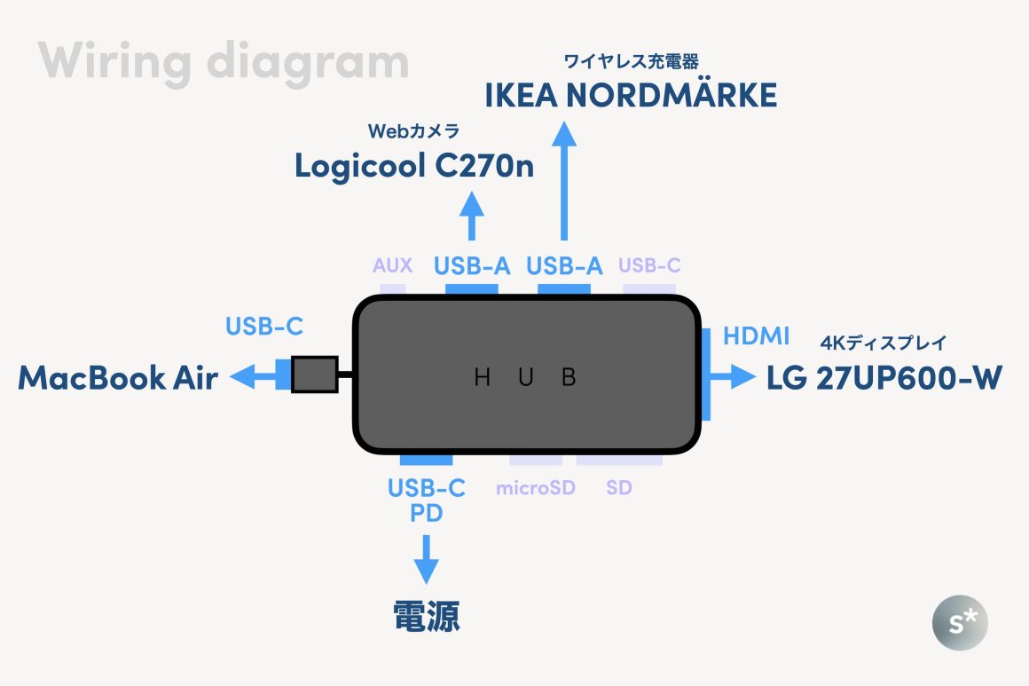 MacBook AirにはUSB-Cケーブルを1本だけ接続したかったので、電源やディスプレイ出力はハブを介することに。以前レビュー用に頂いたものを使っています。