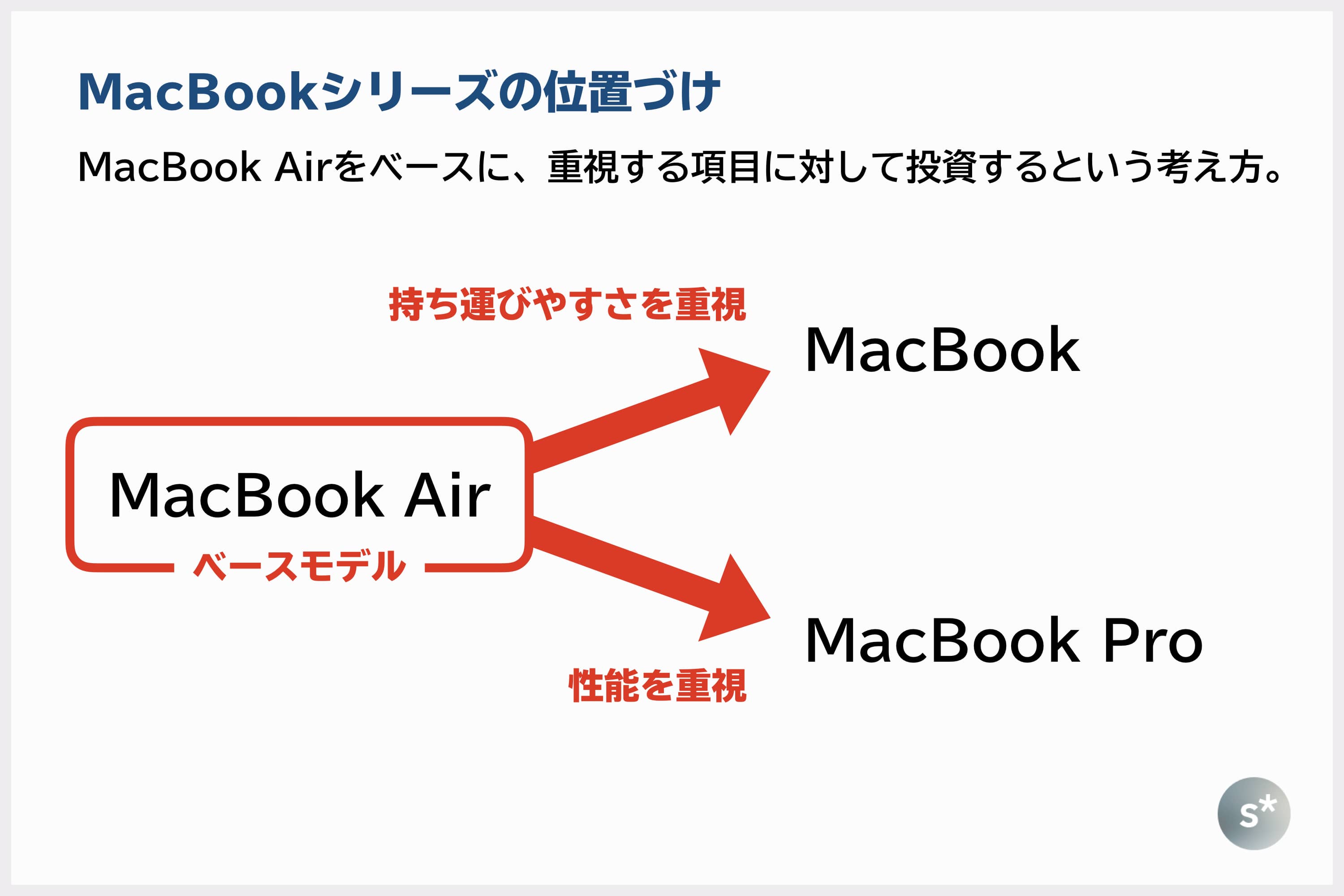 まず、値段が安く手を出しやすいMacBook Airをベースモデルと位置づけます。さらにお金を投資すると、「持ち運びやすさ」や「性能」を手に入れることができます。