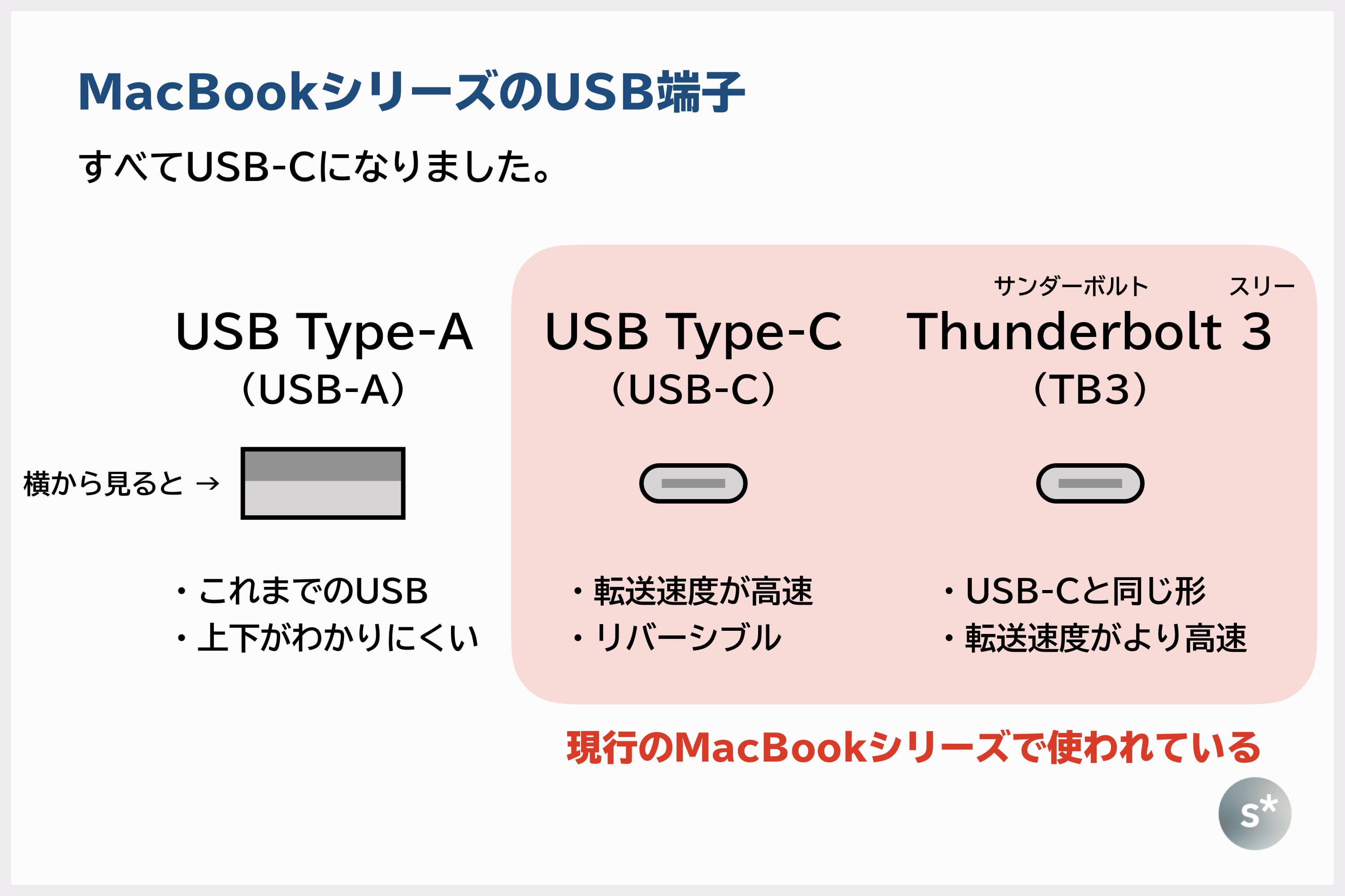 現行のMacBookシリーズを購入するときに注意したいのが、従来型のUSBが使えないという点です。