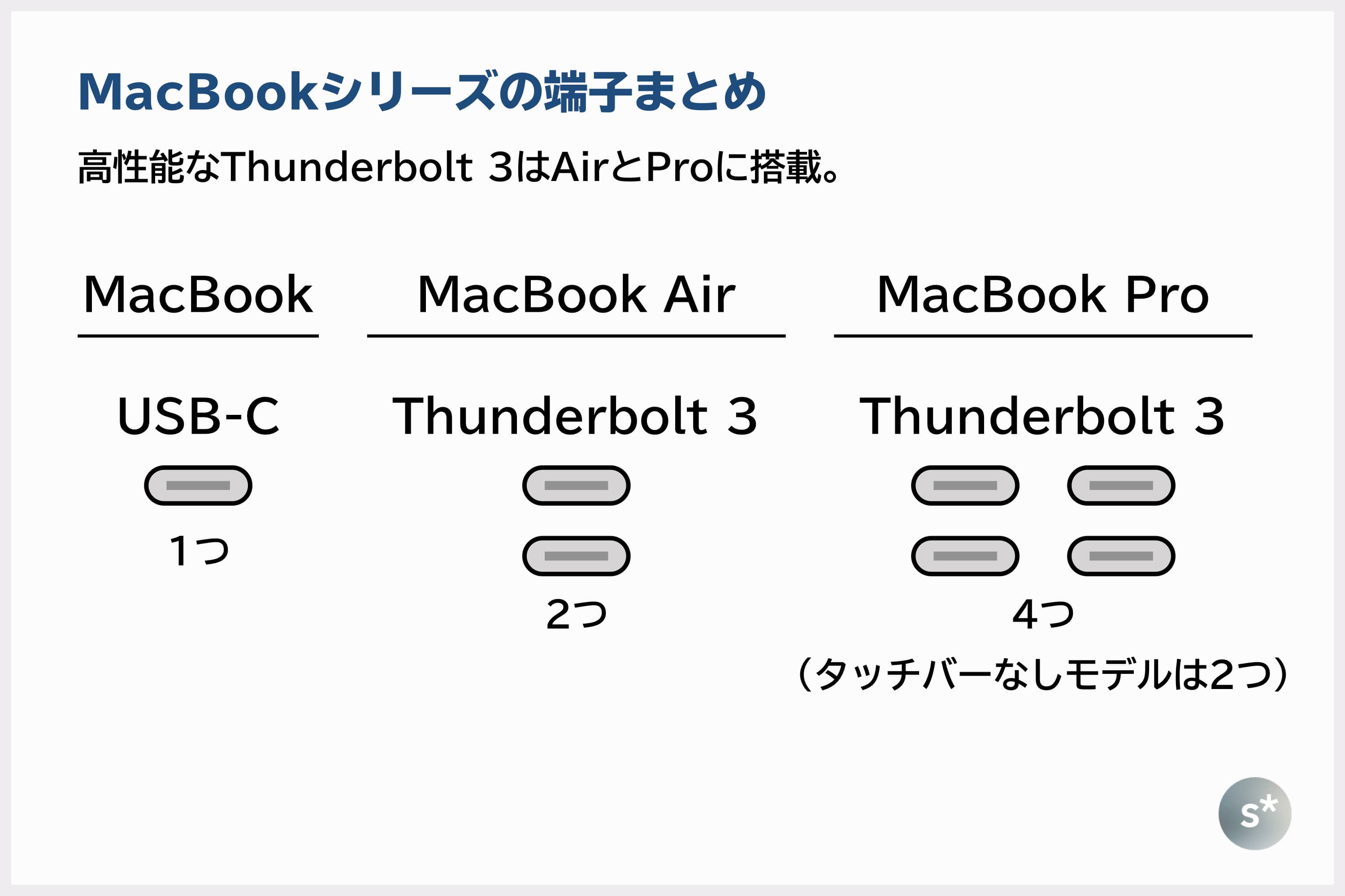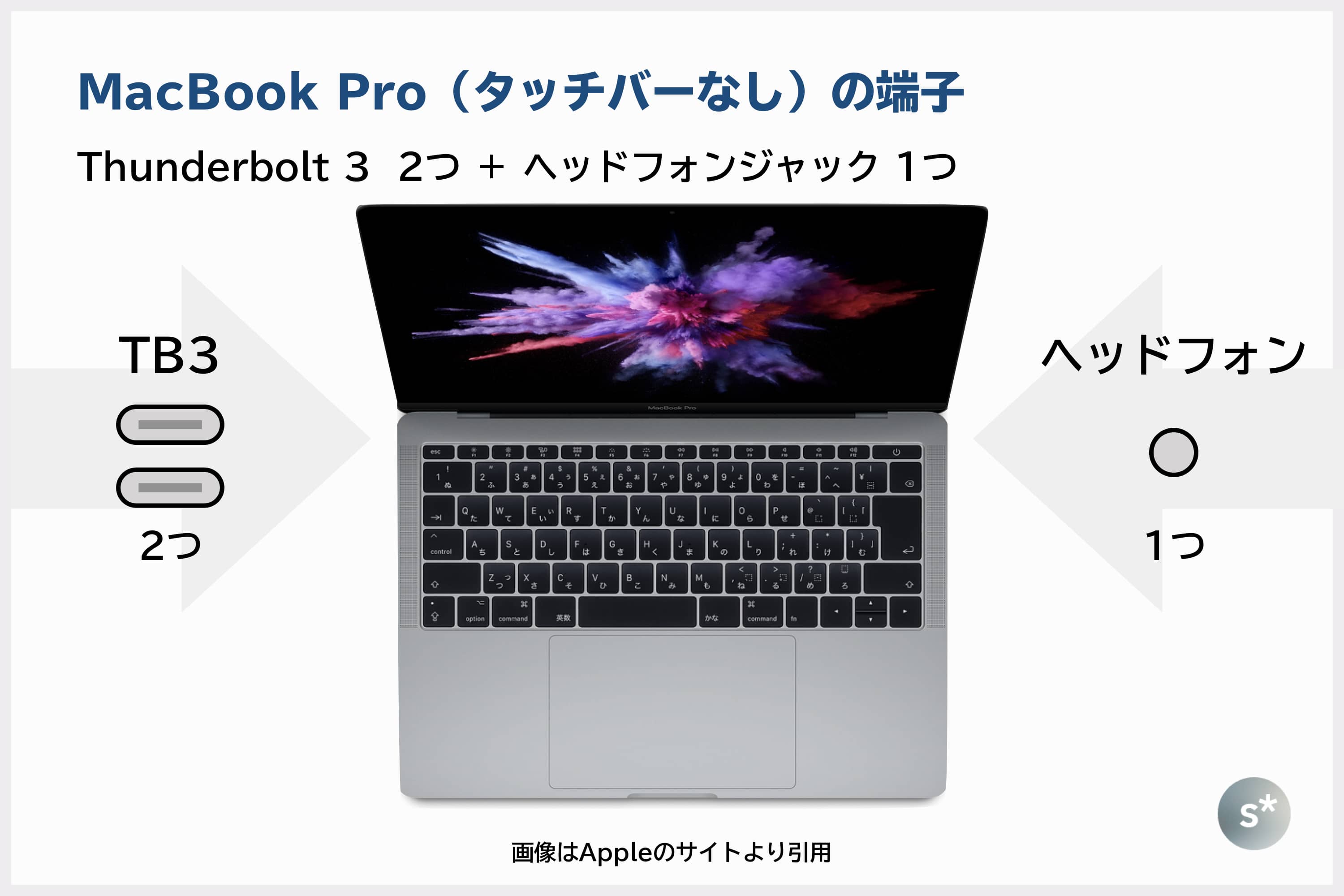 MacBook Proには「タッチバーあり」と「タッチバーなし」の2種類があります。前者にはThunderbolt 3が4つ、後者には2つ搭載されています。