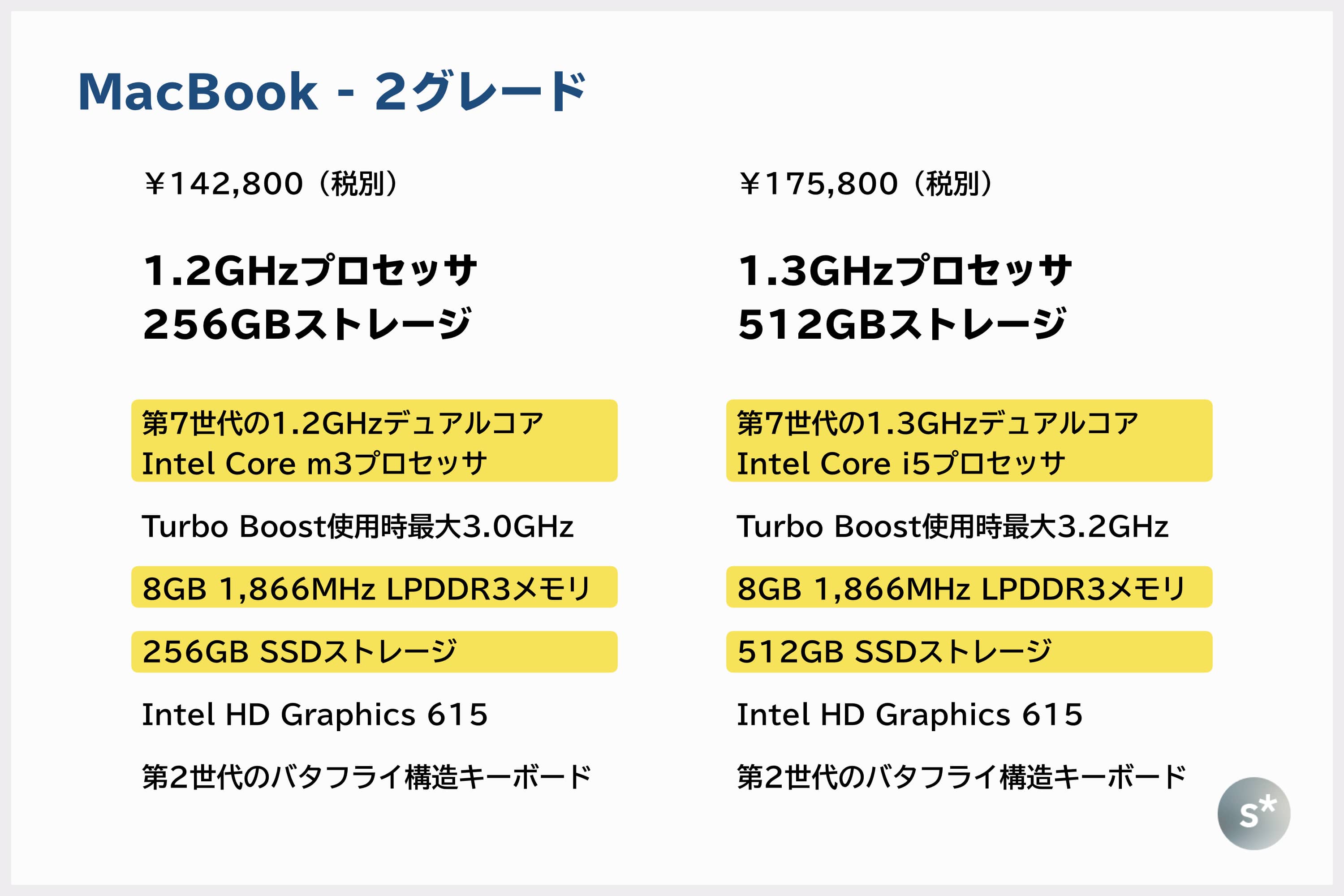 一方、付加価値の高いMacBookやMacBook Proを購入するとなると、ストレージ容量以外にも差があります。