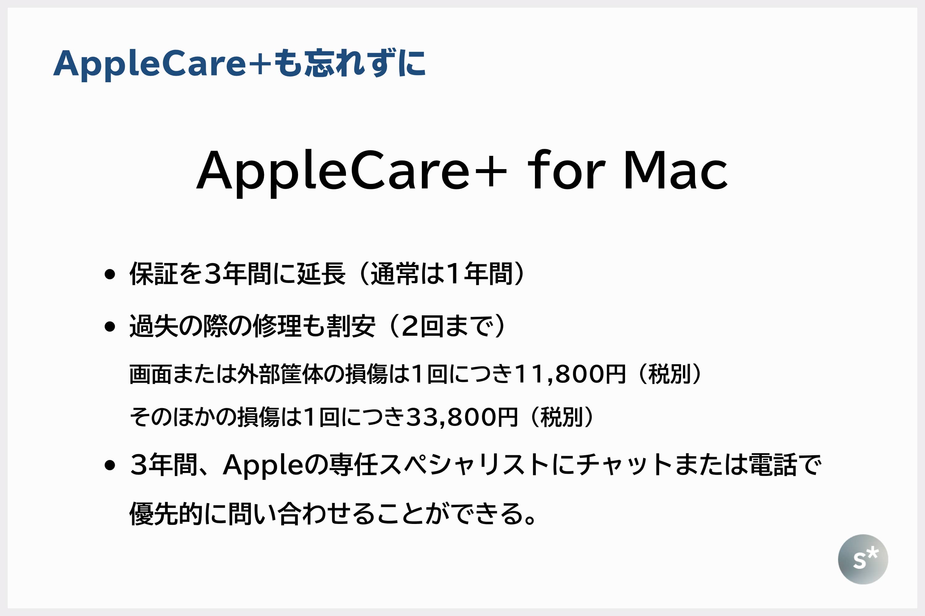 iPhoneをお使いの方ならお馴染みだと思いますが、MacにもAppleCare+という保証サービスがあります。詳しい内容は上の図や公式サイトから確認してもらいたいですが、これは絶対入っておくべきです。