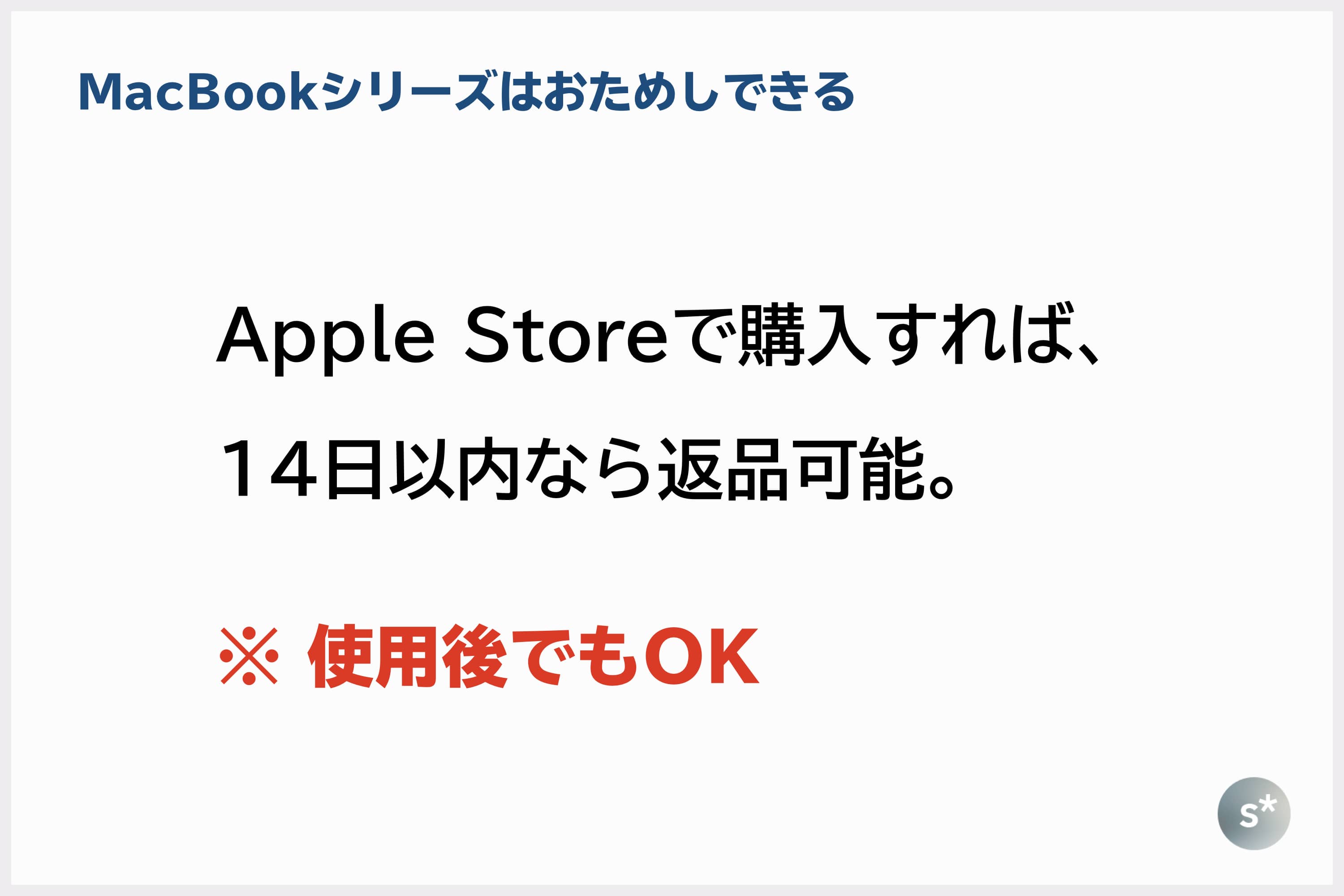 これもあまり知られていないですが、Apple Storeで購入すれば14日以内なら返品できます。これ、開封して使用した後でも大丈夫なんです。