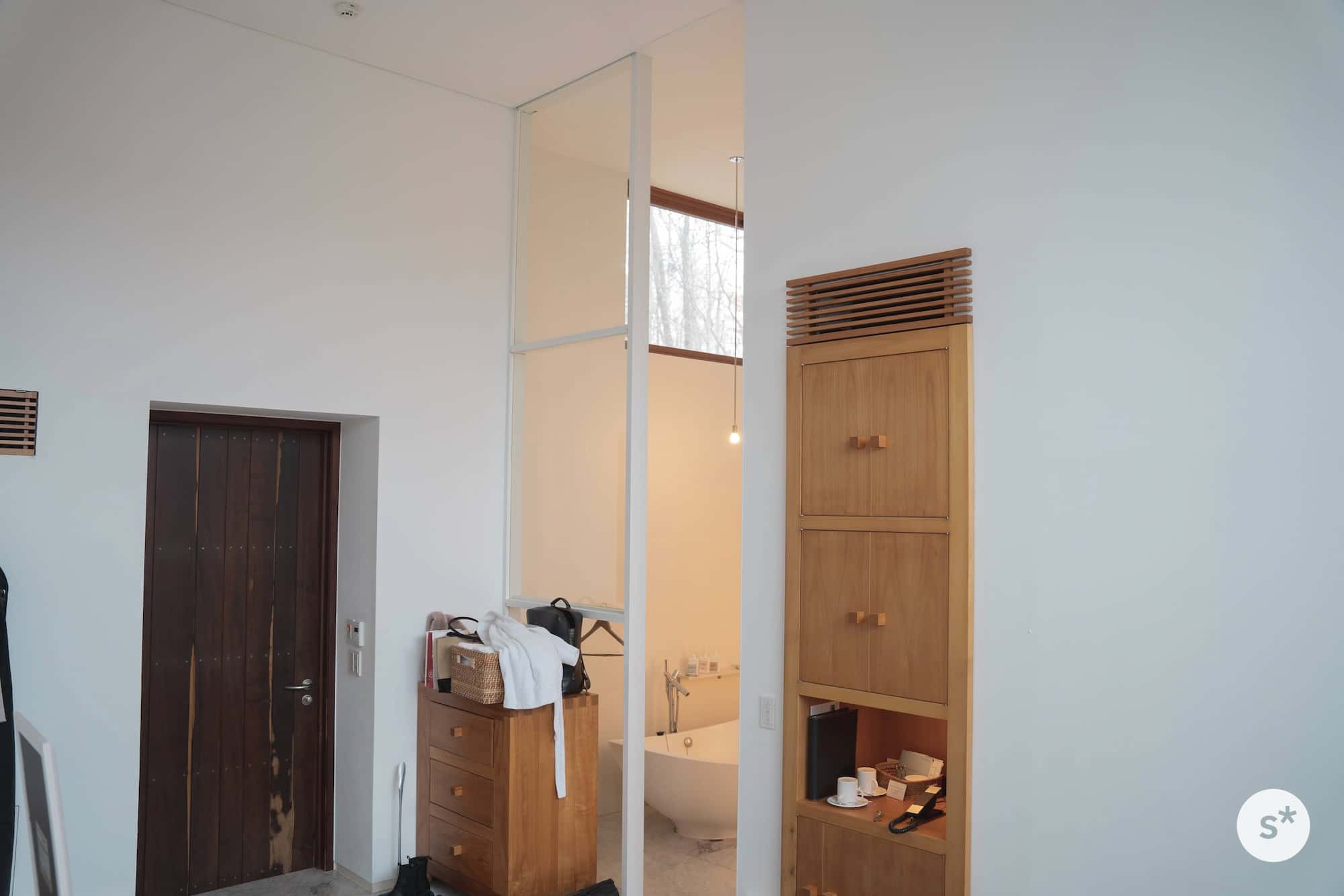 僕らが宿泊したのは「デザイナーズコテージ」というタイプのお部屋。軽井沢高原教会に隣接しており、教会横の小径を通って専用の扉から入ると、特別な空間が広がっています。