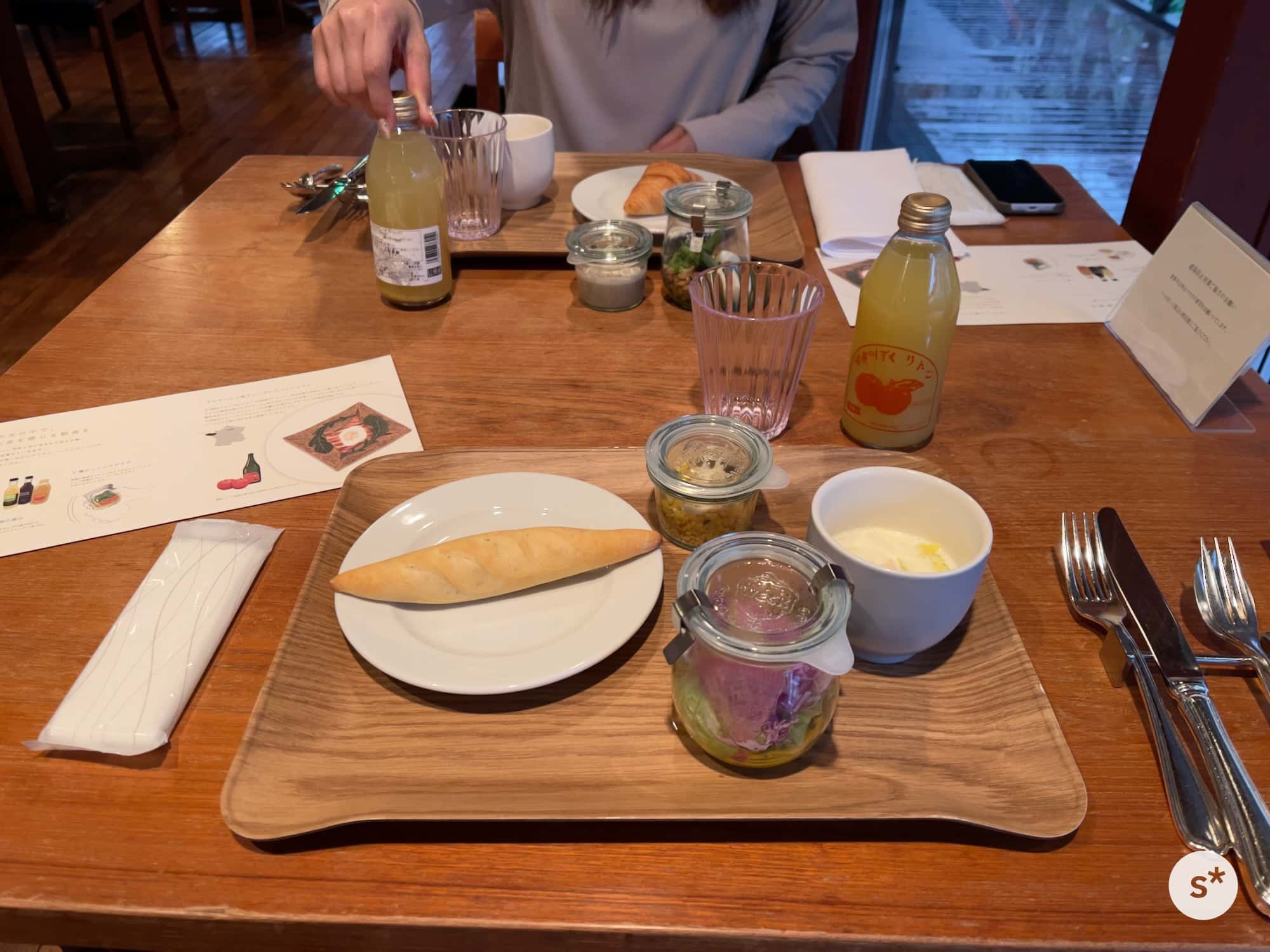 パン、サラダ、スープ、デザートなどは、ブッフェ形式で取りに行きます。瓶に入った100%ジュースもあり、これだけで満足度が高い…!