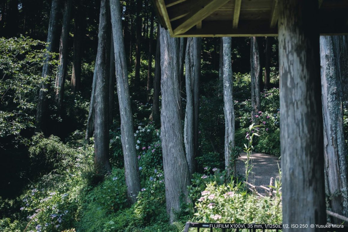 斜面の途中には、木陰にぽつんと東屋がありました。ちょっとした高台になっているので、あじさい屋敷を見渡すことができます。