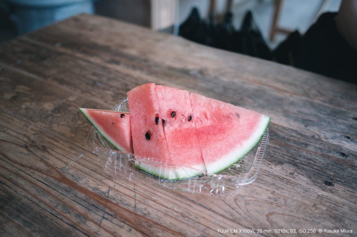 正直、このスイカ目当てで来た部分もあります。山を歩いたあとのスイカって、なんでこんなに美味しいんでしょうね。よく冷えていて、一口食べると甘さが広がっていく、あの感じ。ふっと体の熱が引いていくような感覚があります。うま。