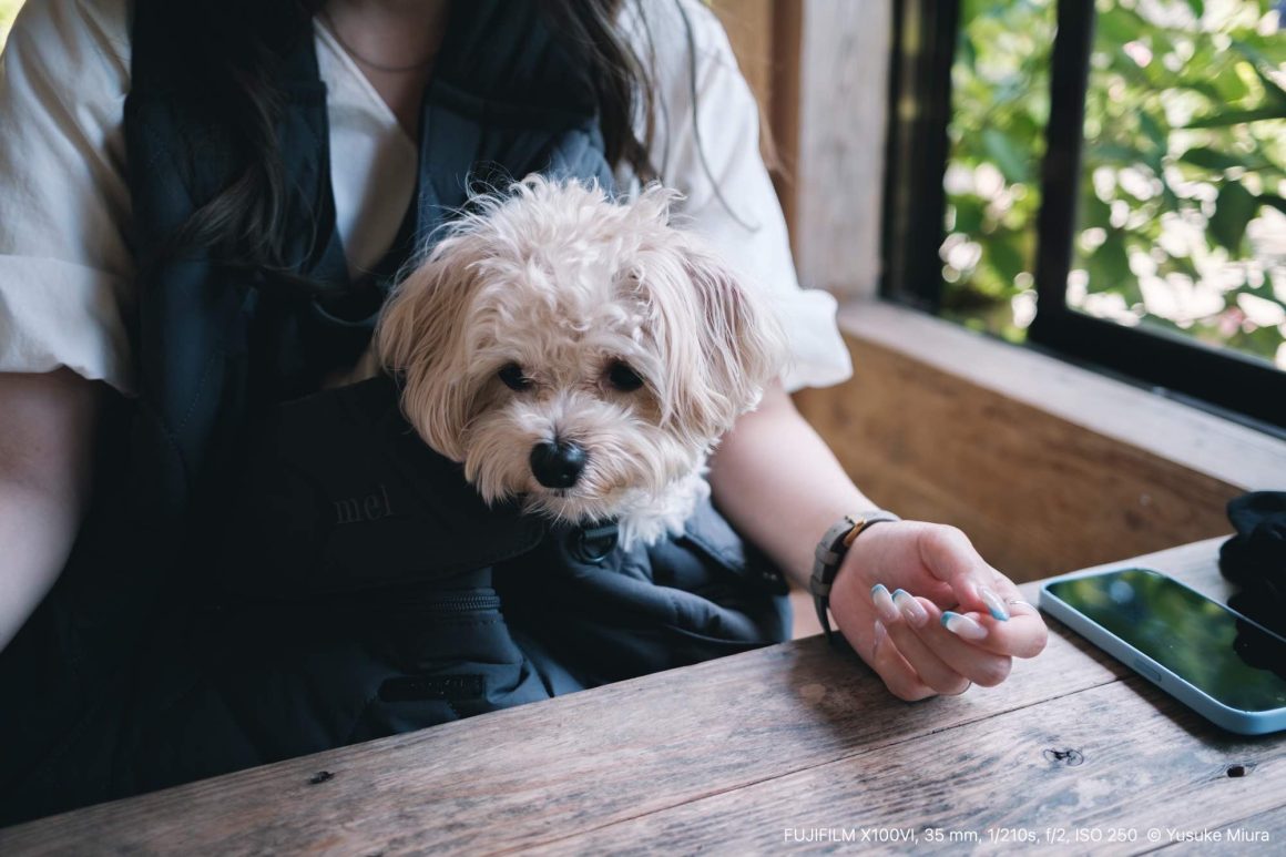 中に入ってもらうと、ちょうどいい具合に顔だけが横からぴょこっと出るんです。その姿があまりにもかわいくて、何度も立ち止まっては写真を撮ってしまいました。