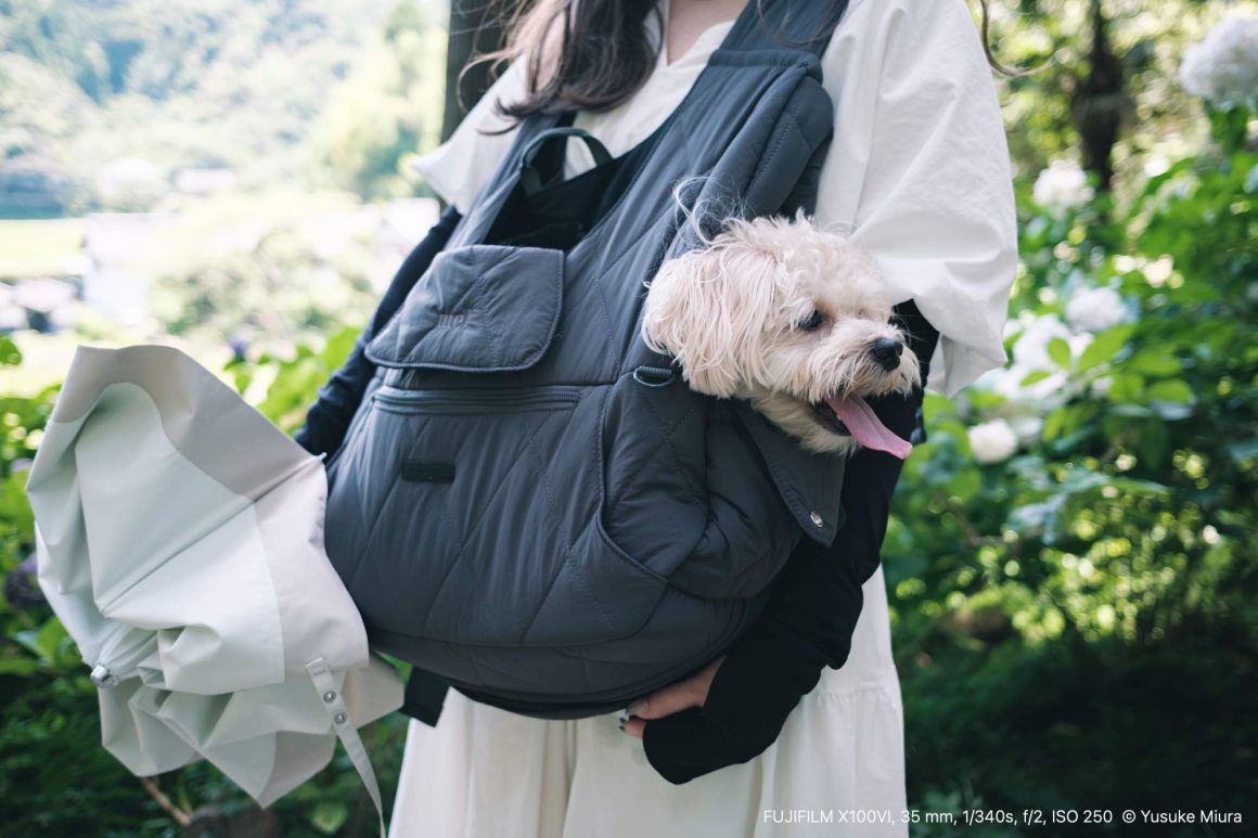 今回の旅に向けて、犬用に新しくバッグを用意していました。キルティング加工された質感高い生地に、名前の刺繍が入ったもの。見た目もシンプルで、上質で浮かないデザイン。犬用の抱っこひもみたいな感じです。妻が背負ってくれました。