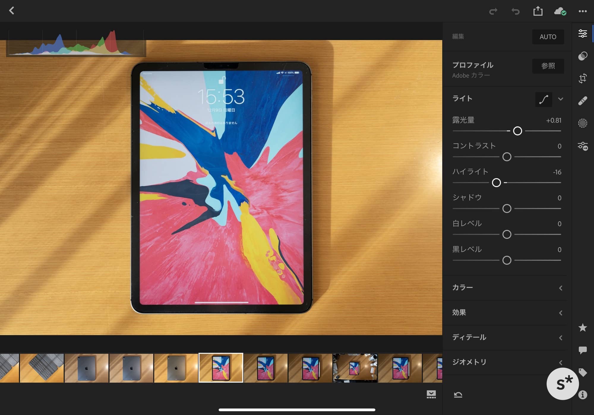 カメラでRAW撮影した写真を「USB-C – SDカードアダプタ」経由でiPad Proに取り込み、Lightroom CCで現像しています。
