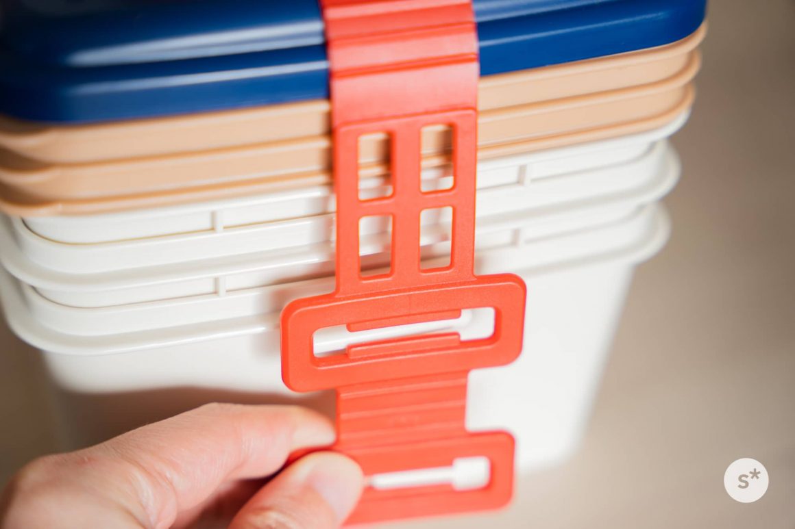 いちばん上にはさらに外蓋を重ねて、赤い留め具で固定します。また、内蓋と外蓋の間に取り皿を入れられるようになっています。