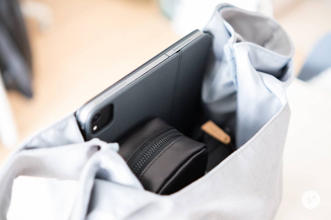 いつでも使えるように机の横に掛けておいて、カフェに行きたくなったときに適当にデバイスを放り込んで家を出る。思いついた瞬間に外出できるので、機動性が上がります。