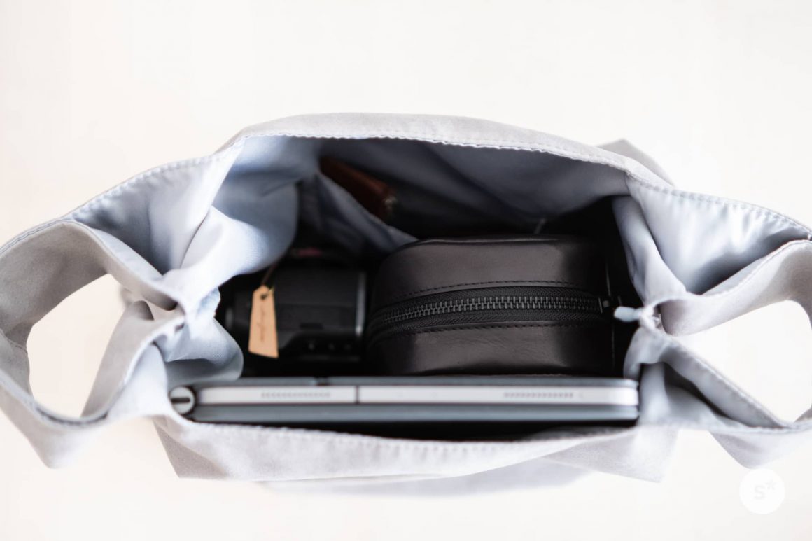 あとは、以上のものを「マイクロスウェード 2wayマルシェバッグ」に適当に放り込んでカフェに向かいます。このくらいの緩い感じが僕にはちょうどよかったです。