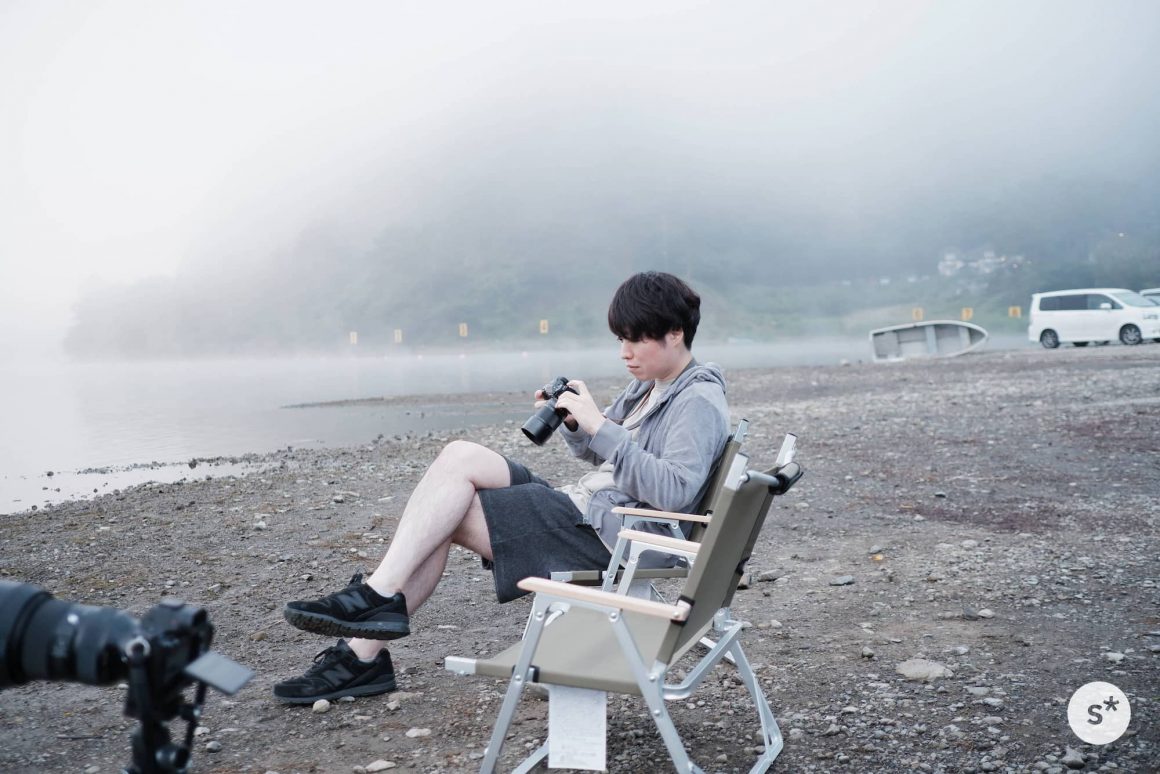 霧がすごいけど、湖畔にカメラと椅子を設置