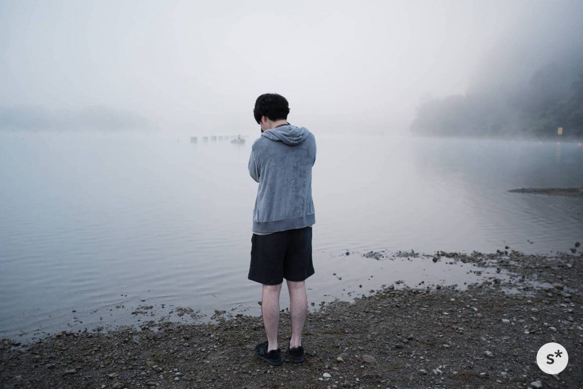 残念ながら、日の出の時間を過ぎても深い霧は晴れることなく、オレンジ色の朝日にはお目にかかれませんでした。しかし、湖畔でのんびりしていることには変わりはないので、写真を撮ったり、持ってきたお弁当を食べたり、iPadで作業したりなど、精進湖の朝を満喫しました。