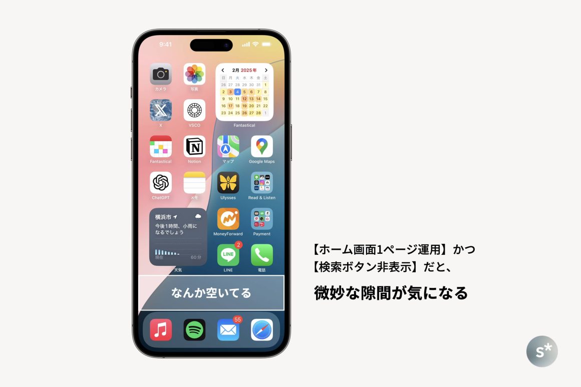 特に僕の場合は、アイコンを整理して1ページ構成にしたうえで、ここに表示される検索ボタンも非表示にしているので、何もない「無の空間」が出現するのです。下手したらアイコンをもう1段置けるんじゃないかと思えるほどの隙間が空いています。