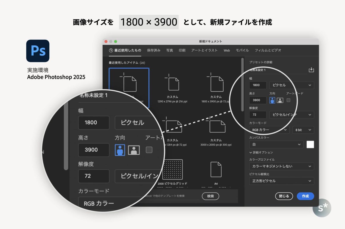 そこで最初にやるべきことは、「9 : 19.5」の縦横比に合わせたキャンバスを作成すること。 例えば、幅1800px × 高さ3900pxにすれば、画面いっぱいに写真がジャストフィットする壁紙を作れます。