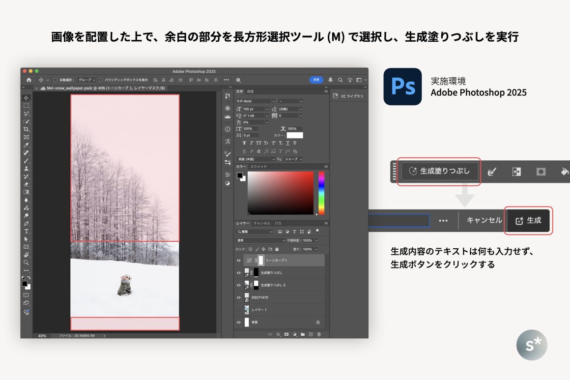 PhotoshopがAIを使って周囲の画像をもとに余白を埋めてくれます。僕の写真では、雪景色が自然に広がっていく感じに仕上がりました。