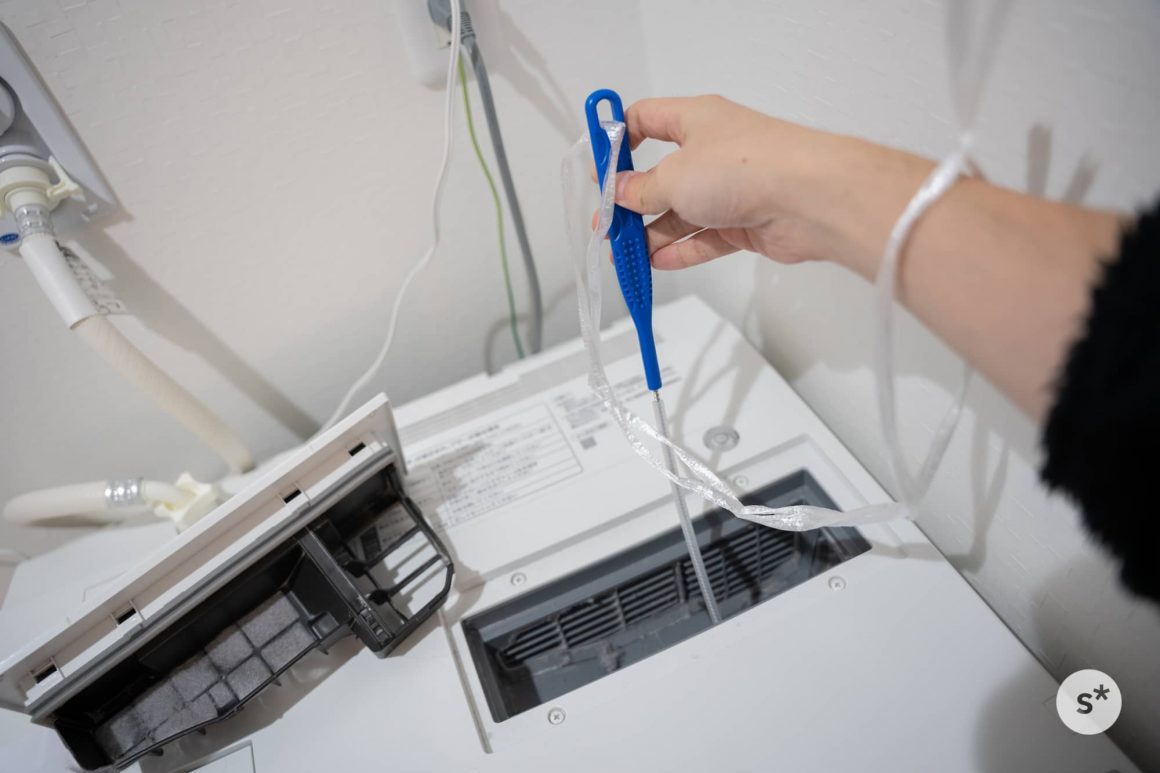 汚すぎるので実物の写真は載せられませんが、ここもめちゃくちゃ汚くなるので定期的に掃除が必要です。排水に含まれる埃に柔軟剤が固まってドロドロになった感じなので、心して開けてください。