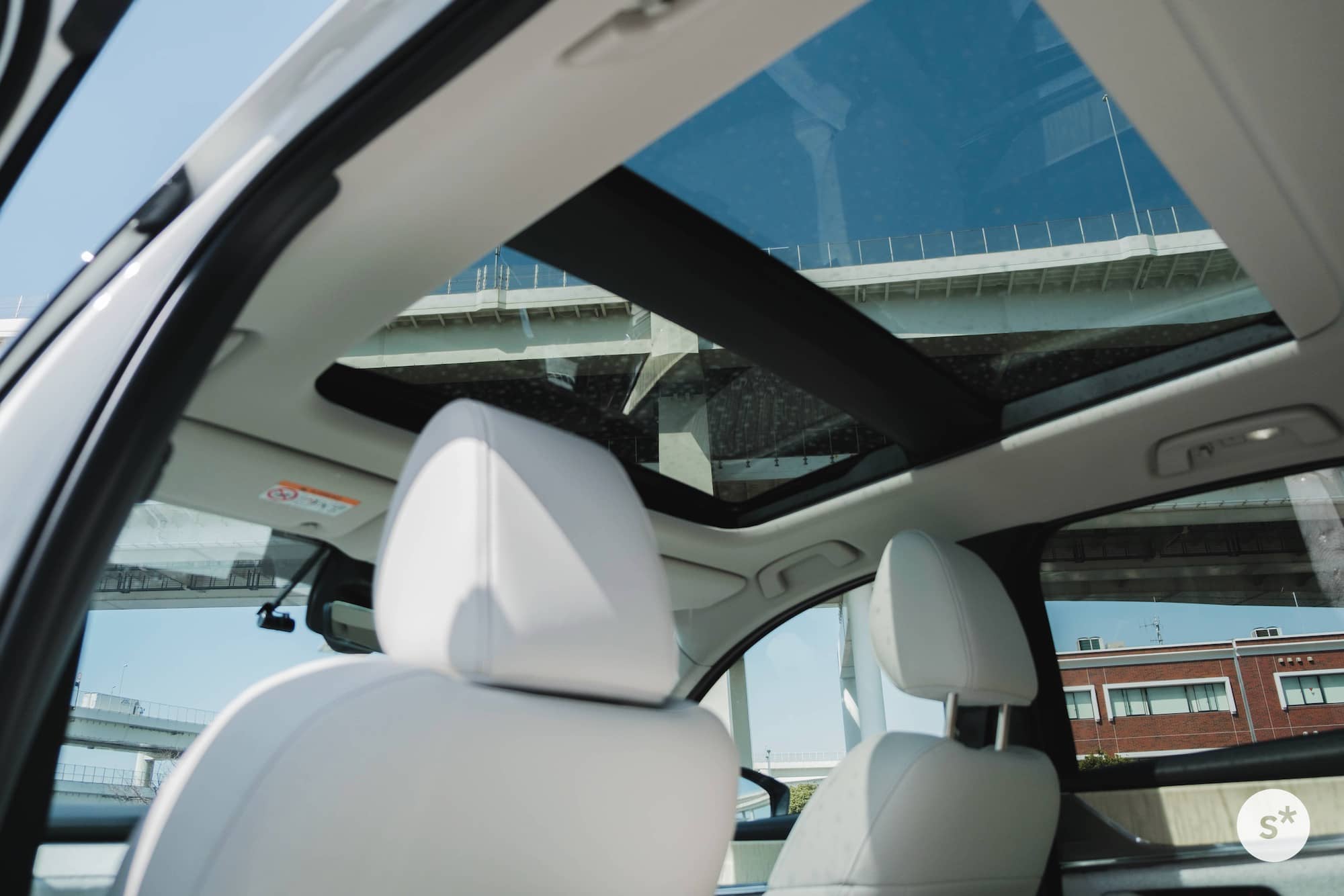 また、白い内装と相まって、車内がとても明るくなります。明るく感じるのではなく、本当に明るいんですよ。だからといって、不思議と日差しが熱いわけではないし、優しく照らしてくれる光が空から降り注いでるような感覚。