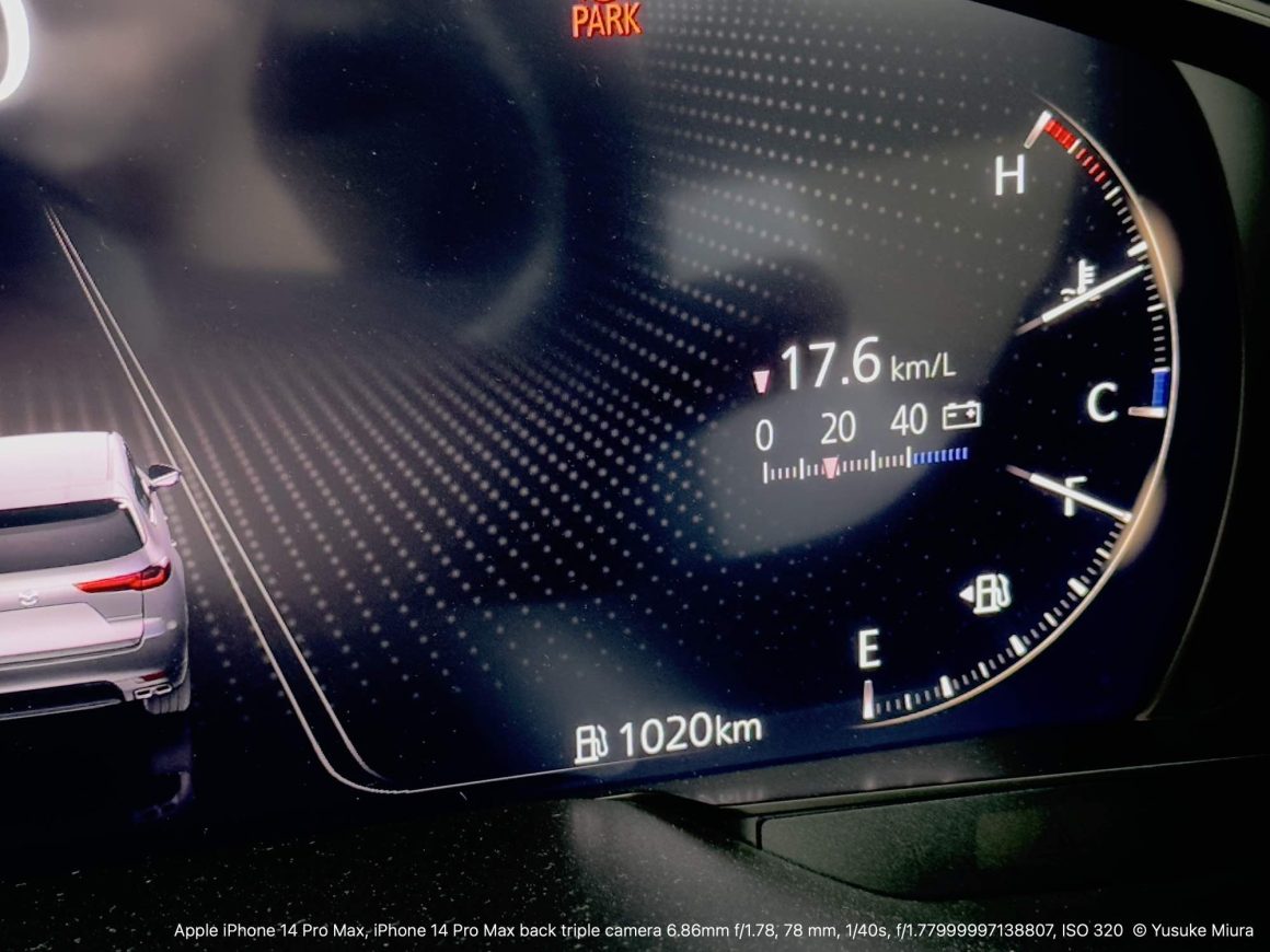 ここで注目したいのは、その下に出ている航続可能距離1,020kmの表示。おそらく直近の走行状況と燃料の残量から算出されているのだと思いますが、1,000km超えの数字を見ると、さすがのオーナーでも驚きます。