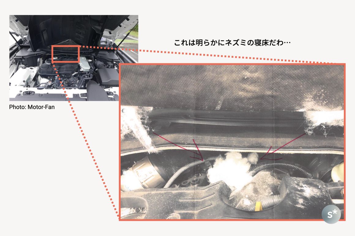 ただ、これ由々しき事態でして。今回は吸音・断熱材の被害だけで済んだのですが、さらに大きな被害の芽のような気がしてなりません。ベルトにネズミが巻き込まれると悲惨なことになるし、エンジンの配線を囓られた事例などもあるようでして。