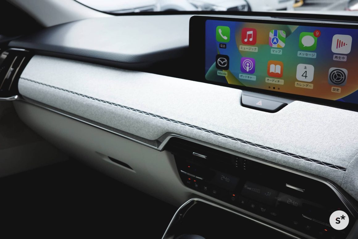 サステナビリティが叫ばれる現代でありつつも、光の当たり具合で表情を出したいからCX-60では自然素材にこだわっているとどこかで聞いたことがありますが、その効果はあらゆる場面で感じることができます。