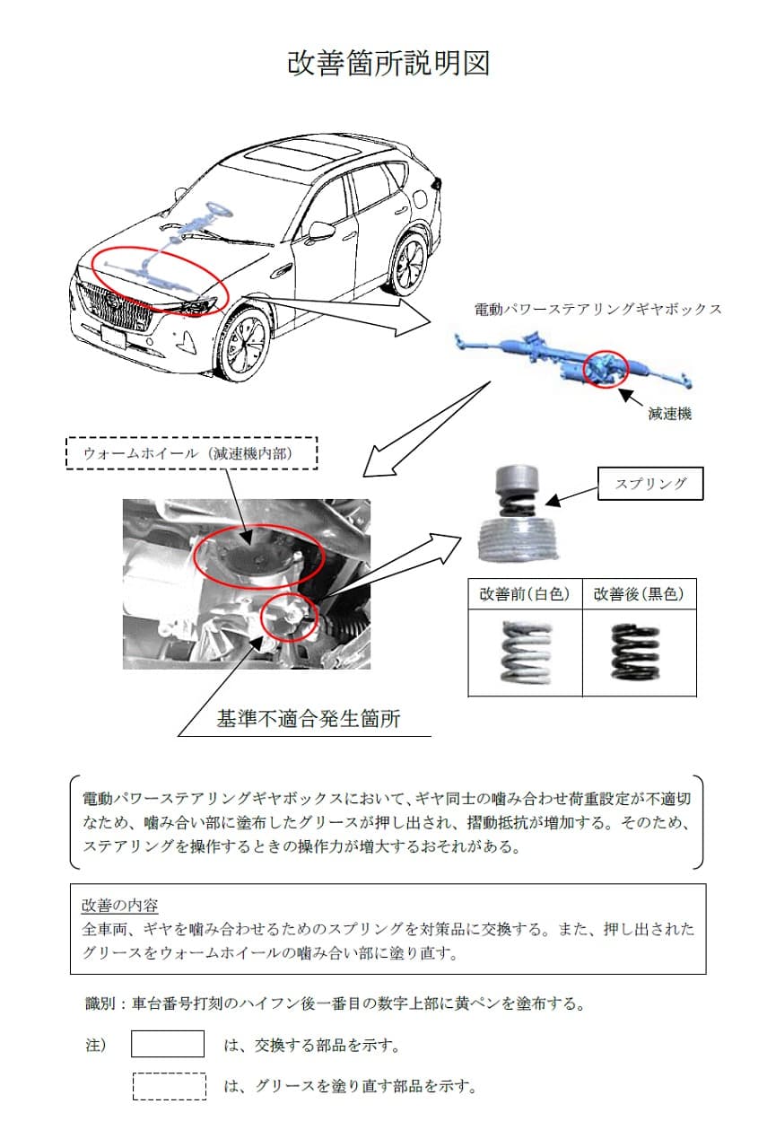 このリコールのメーカー資料が分かりやすいので引用すると、右上にある「電動パワーステアリングギアボックス」と書かれた青いパーツ、これをそっくり交換します。なかなかの大物です。