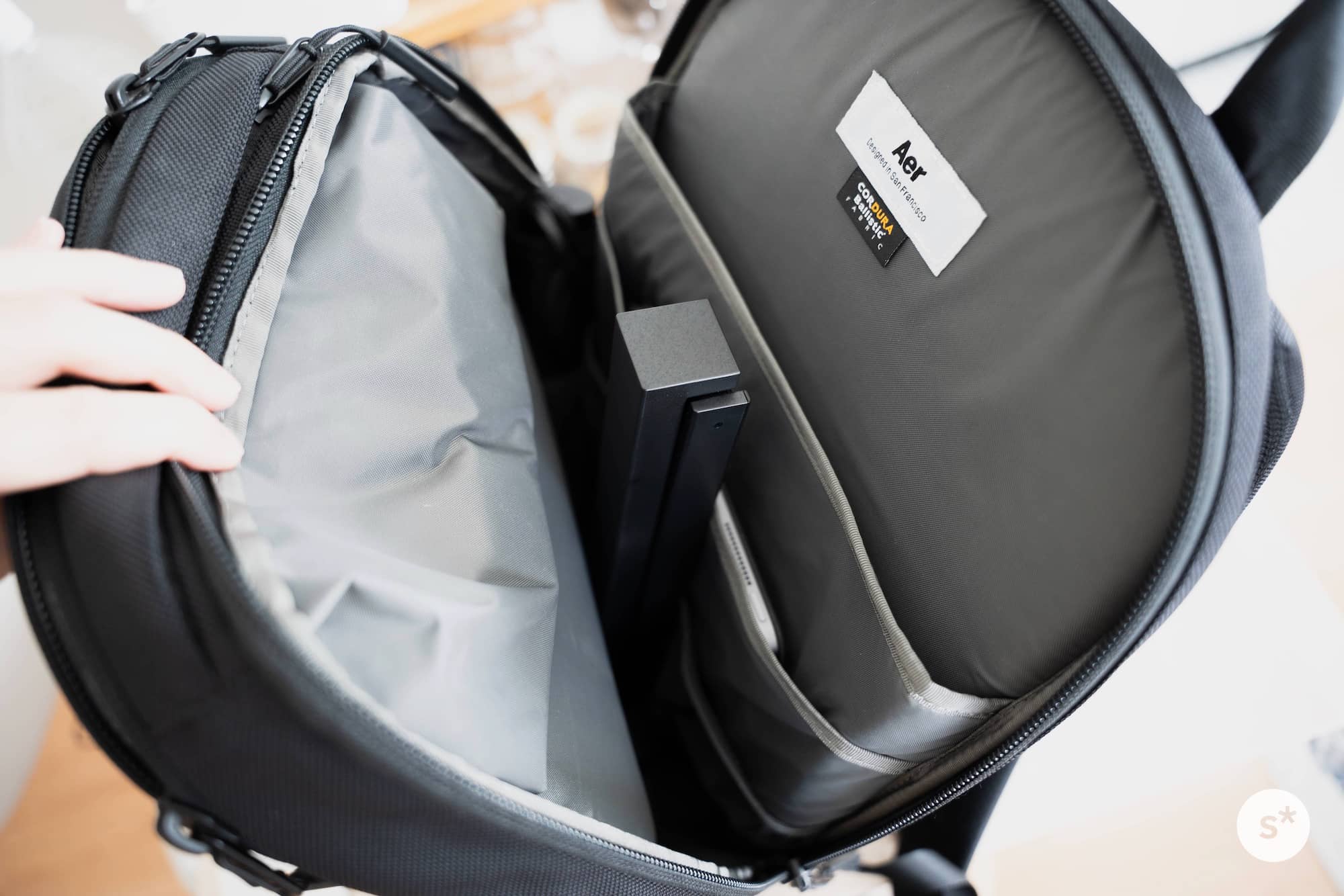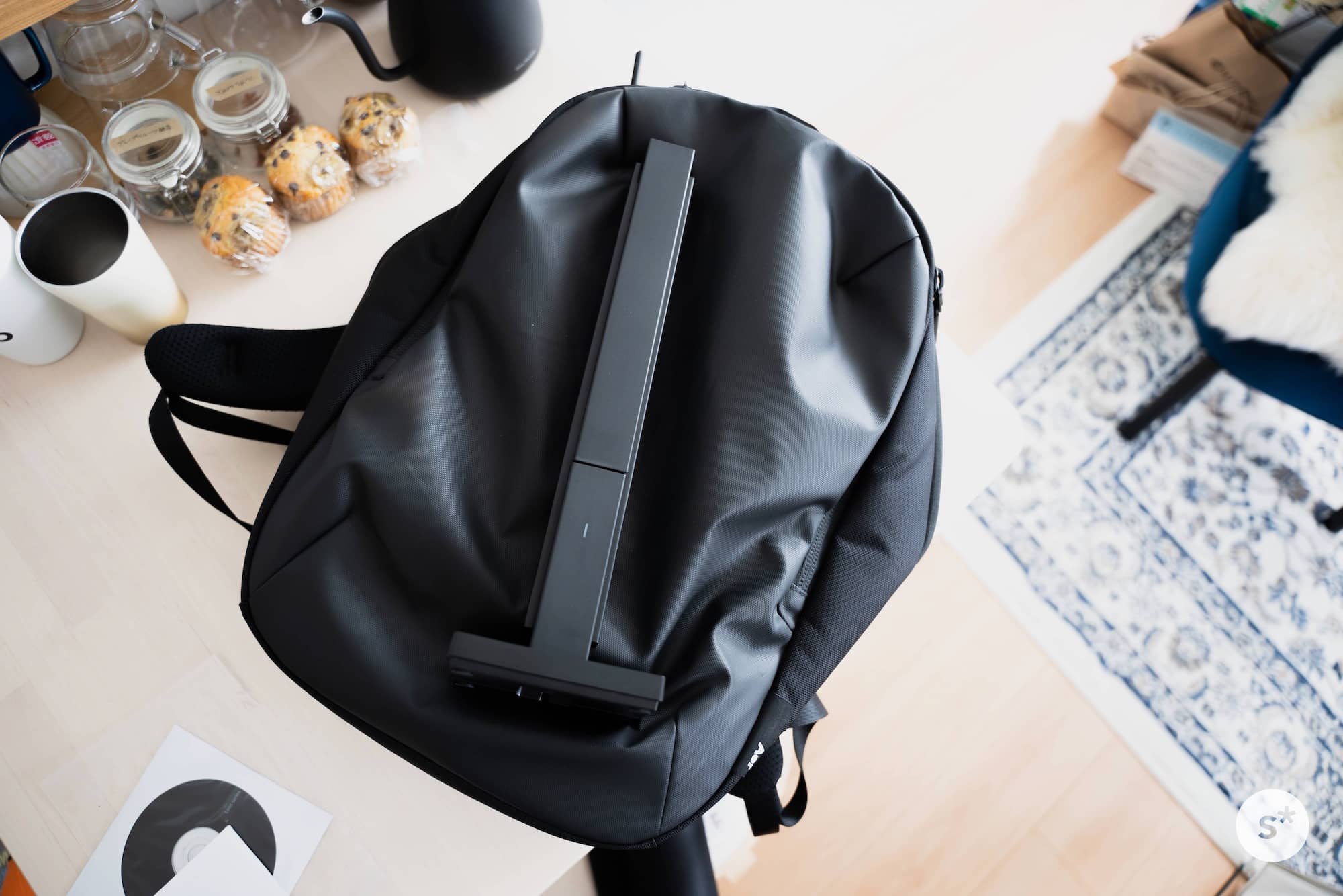 普段通勤に使っているAerのバックパックに入れてみました。全く無理することなく、普通に入りました。別に誇張しているわけではなくて、本当に日常的に持ち歩けるサイズなんです。台座が外れればもっといいけれども。
