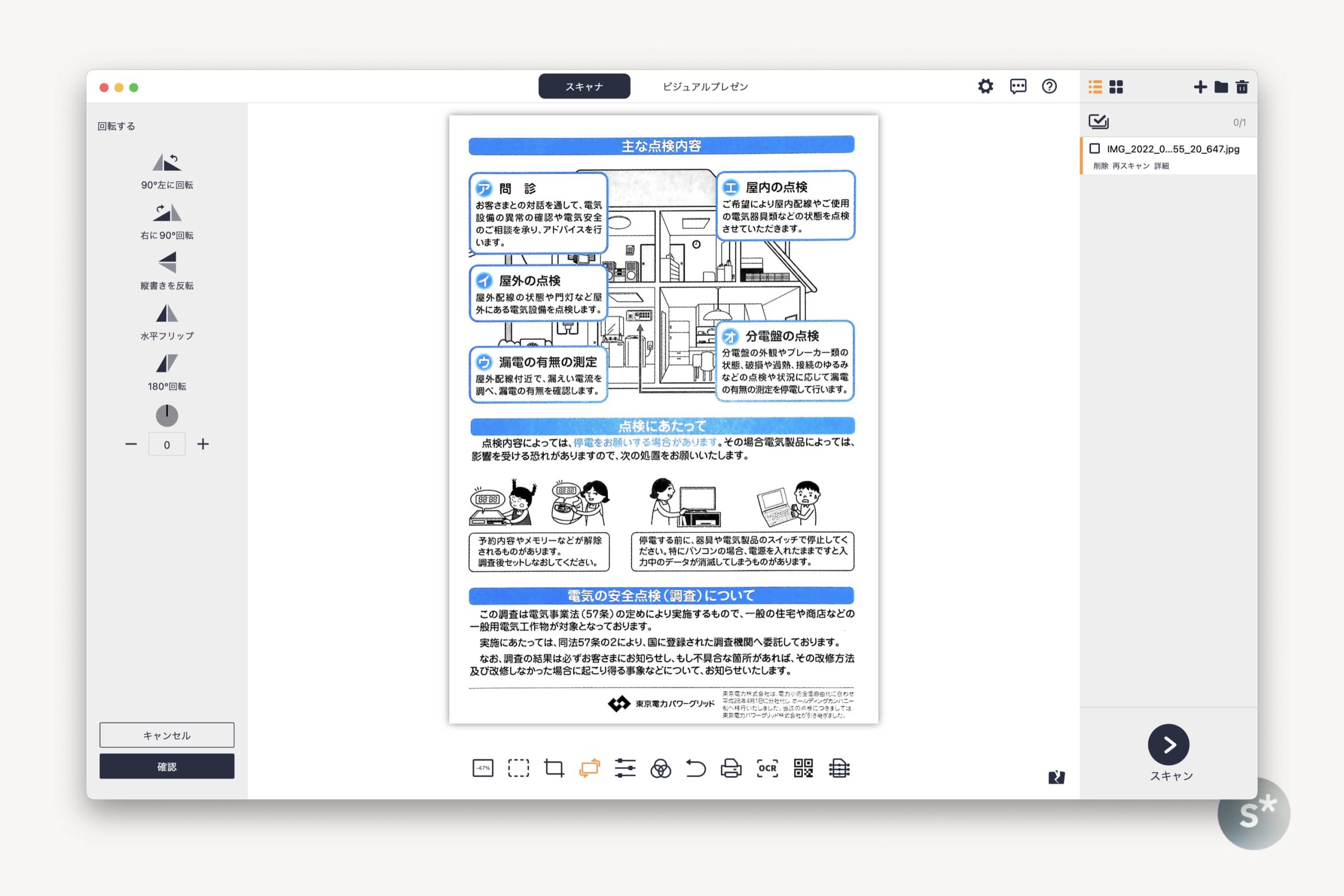 もちろん、スキャンした後にワンクリックで回転させることもできます。縦向き書類を横向きでスキャンしてしまっても全く問題ありません。ここでは右に90°回転させました。
