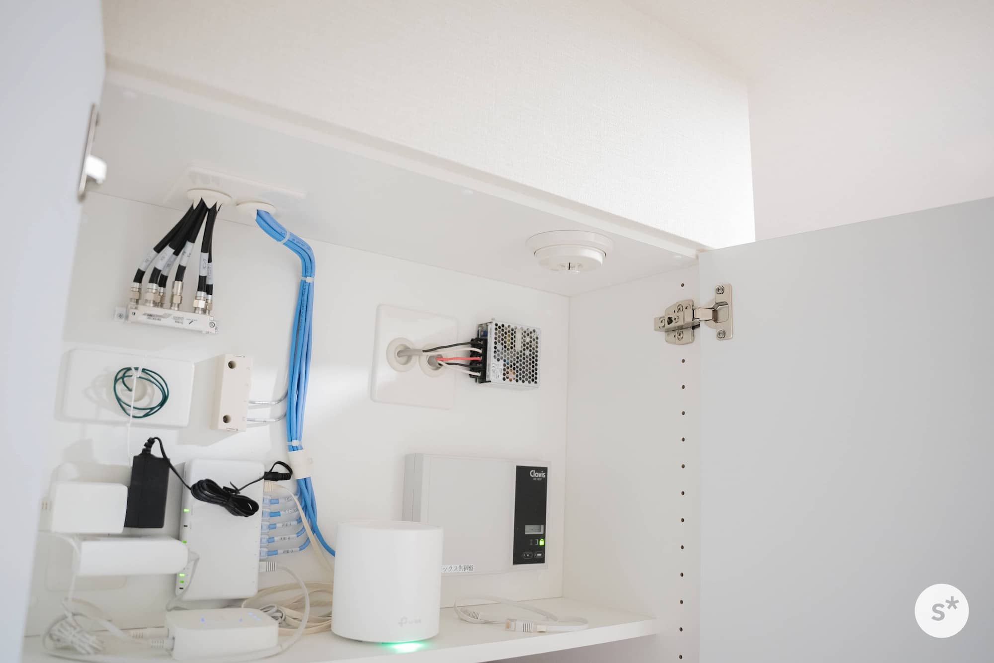我が家の場合、WAN側のEthernetケーブルも、各部屋に分配されるEthernetケーブルも、リビングの物入れに集約されています。そのため、1台目のDecoはこの物入れの中に入れることにしました。
