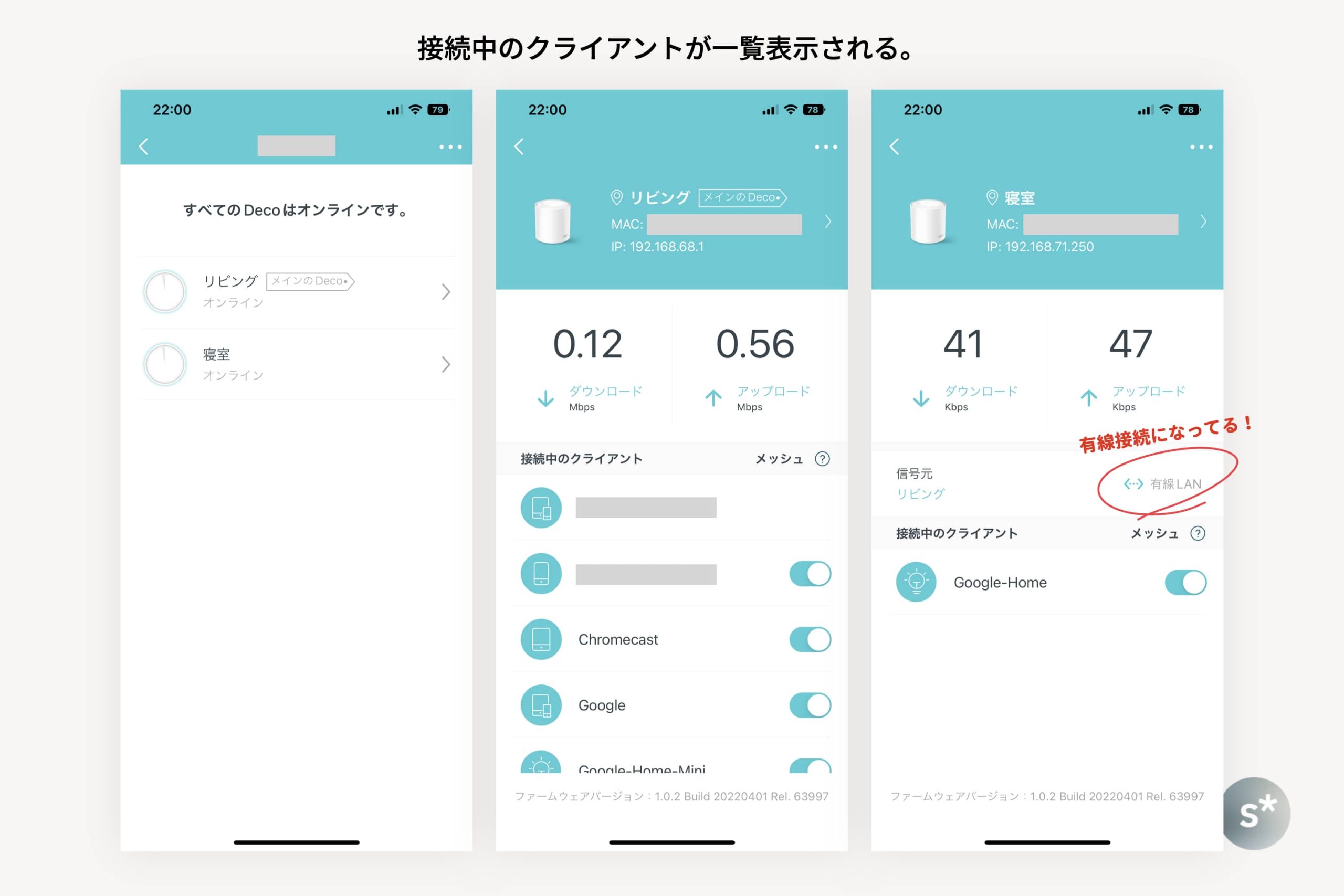 Deco本体とアプリの連携の部分までしっかり作り込まれていて、とても使いやすい。アプリには接続中のクライアントが一覧表示されたりします。