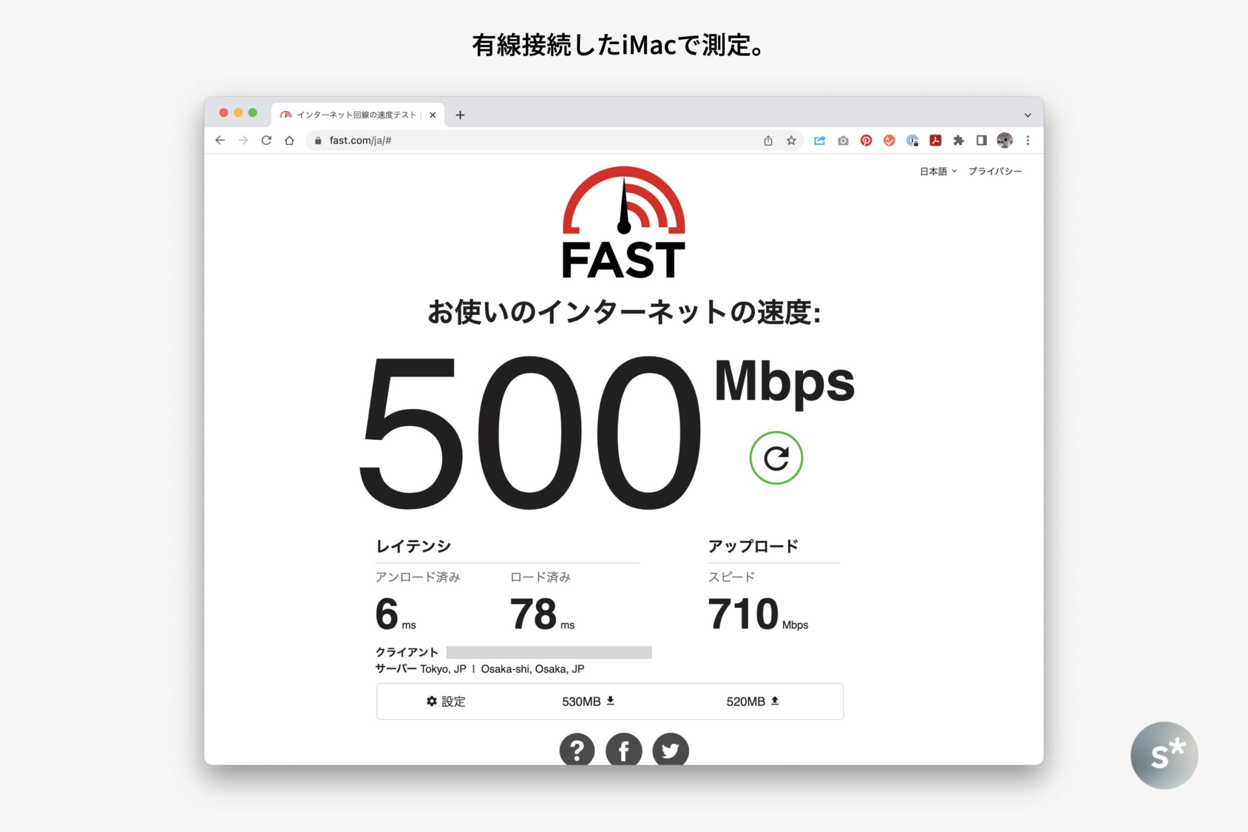 まずは有線接続したiMac。下り500 Mbps、上り710 Mbpsとなり、まずまずの結果です。有線なので速くて当たり前ですね。